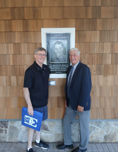 In a speech sprinkled with comedic remarks fully characteristic of his inimitable sense of humor, Schmiddy expressed heartfelt thanks to his family, including his wife of 46 years, Lisa Schmid, also a former D-E faculty/staff member and coach. He also thanked the many individuals responsible for the construction of the Pavilion, which he felt was a much-needed shelter and rest stop for athletes and their families. “This beautiful Pavilion is more than just a building to me,” he said. “It’s a testament to the community that’s been my home for nearly five decades… I’m so proud to be a part of the School story, and I look forward to seeing the wonderful things that will happen here.”