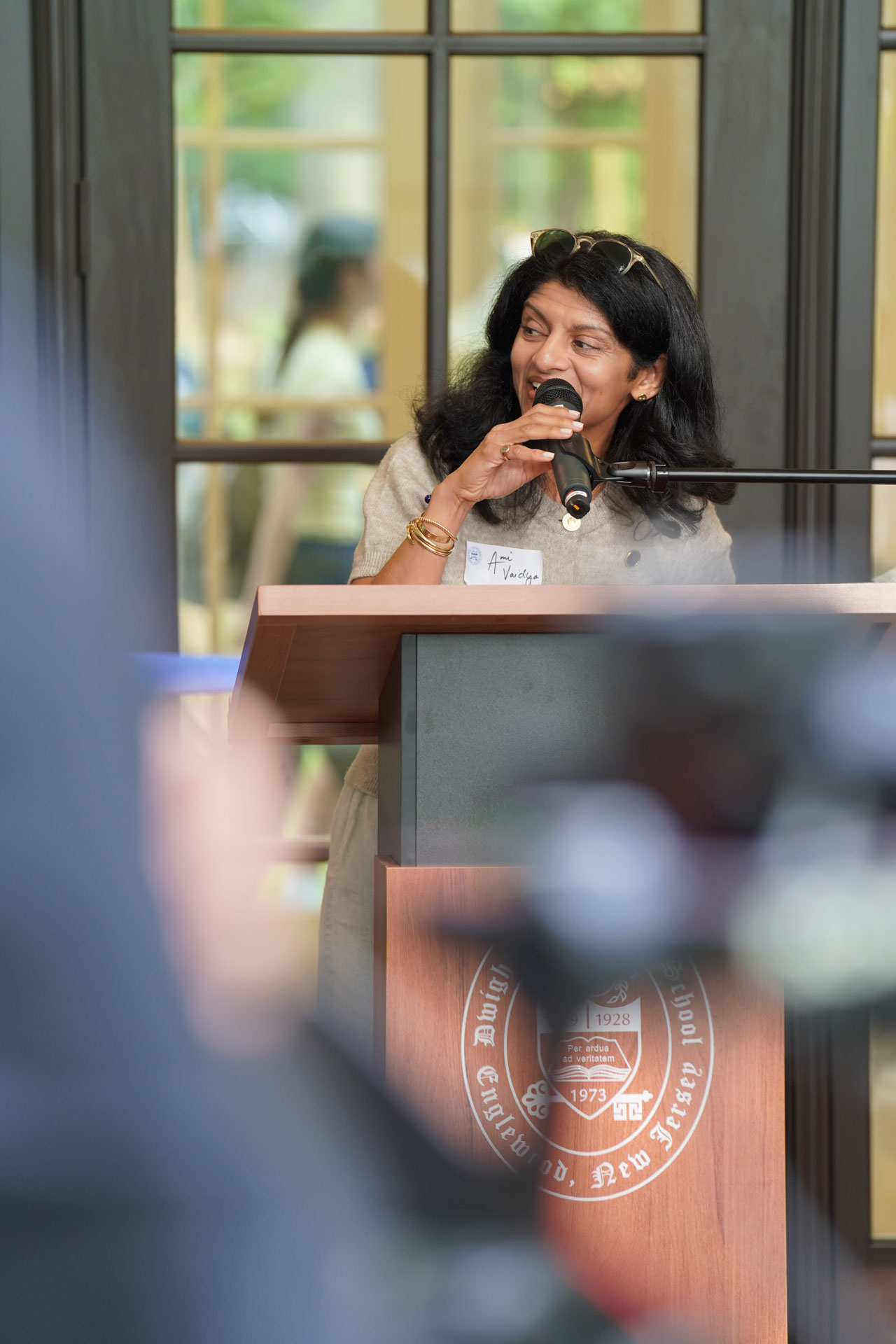 D-E Board of Trustees President Dr. Ami P. Vaidya ’91 P ’24, ’26 gave welcome remarks and spoke about “how amazing it is at a school like ours where the past and the present always come together” and acknowledged the huge impact that Coach Schmid made on the lives of D-E students and families.