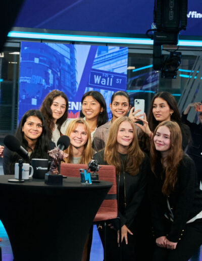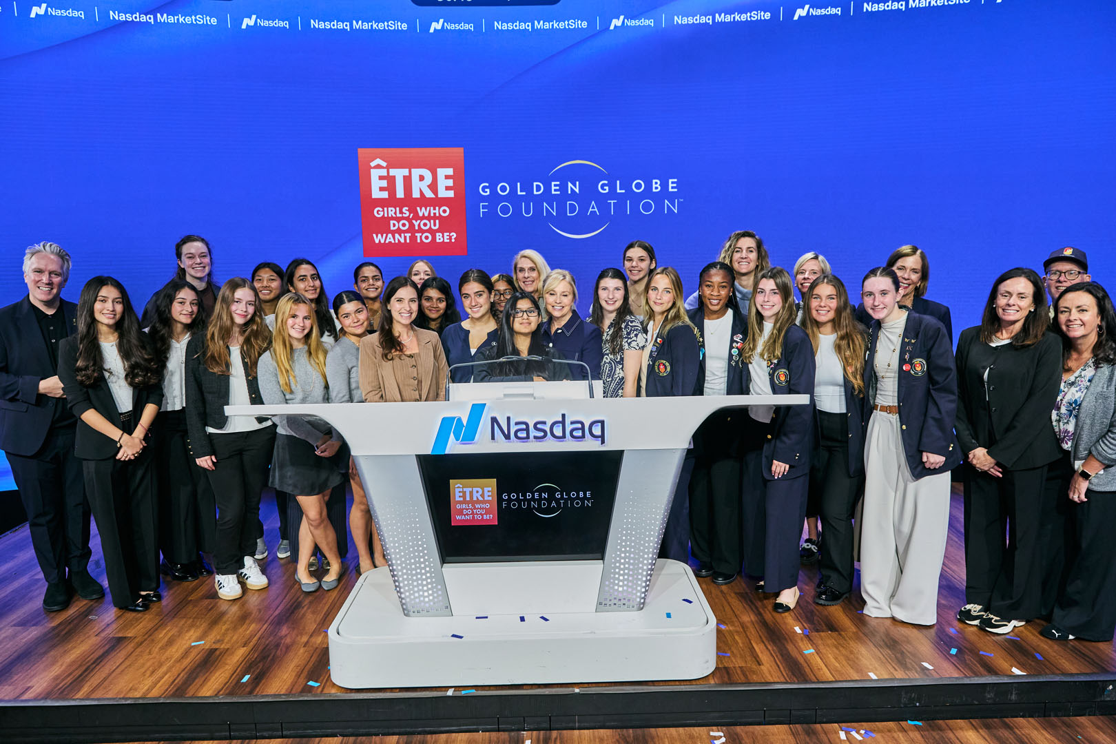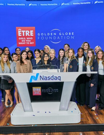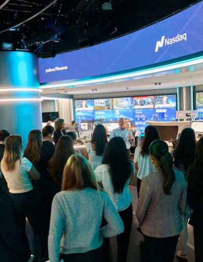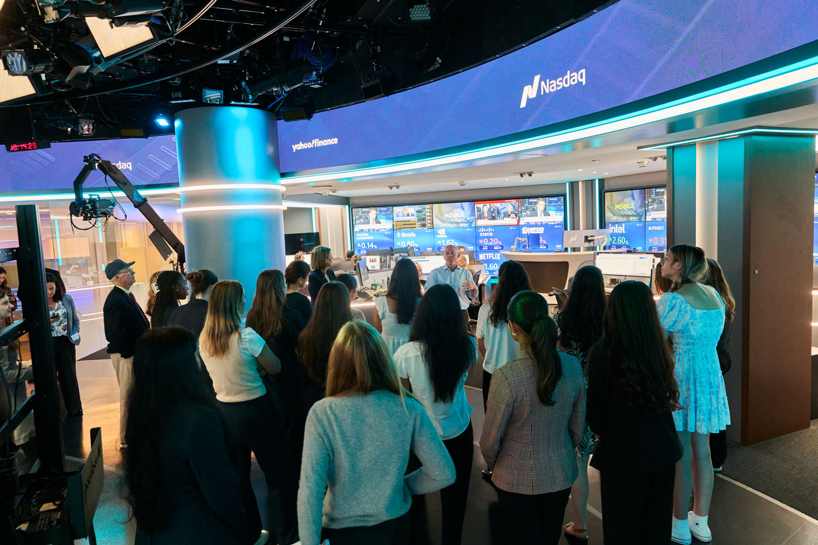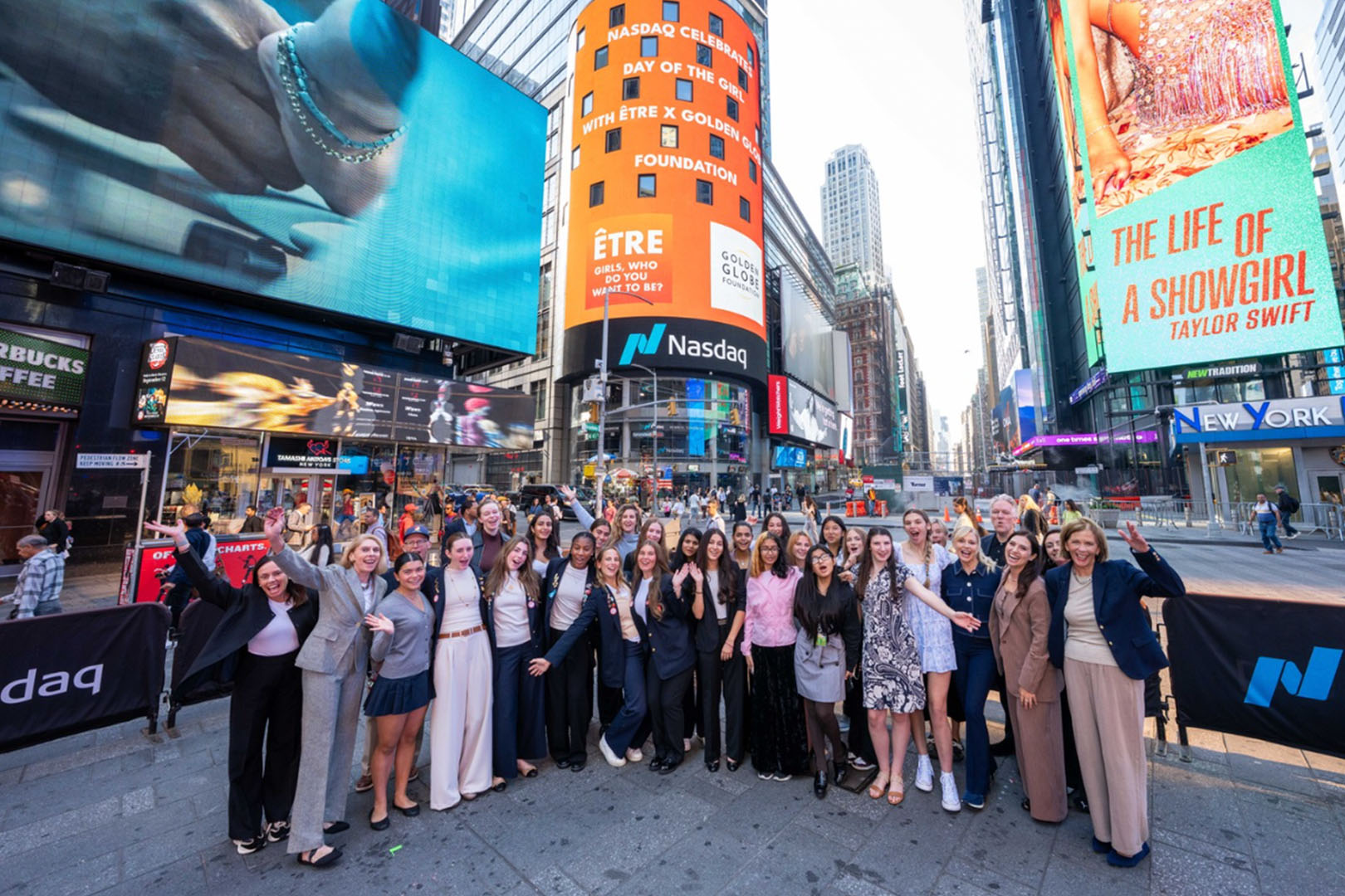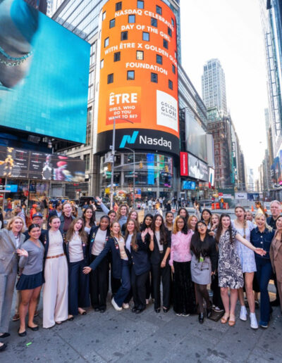 Club Être, a chapter of the greater Être organization run by D-E alumna Illana Raia ’86 and led by student leaders Anna Ibargüen ’26, Ella Siew ’26, and Daniela Hochstadt ’28, recently took a field trip to Nasdaq headquarters in New York. They were invited by the Golden Globe Foundation to celebrate the “Day of The Girl” and witness the opening of the market and bell-ringing ceremony at the Nasdaq MarketSite in Times Square. Later, they were given a tour of the Nasdaq building and listened to a female-led panel presentation featuring two Nasdaq employees and a representative from the Golden Globes. “This field trip helped us learn about possible career paths we might want to pursue in our future and allowed us to meet amazing women [who excel in their professions],” said Daniela, who added that opportunities like this help D-E students foster a desire for lifelong learning. Anna remarked that her personal highlight was hearing from the panelists about being a young woman in a male-dominated professional setting like finance and economics. “We got a lot of advice about holding your own ground, letting your work speak for your qualifications, and the importance of networking,” said Anna. “‘If you can see her, you can be her’ is one of the motivations behind a club like ours… [This] is so inspiring and shows us that there really is a world of possibilities out there!”