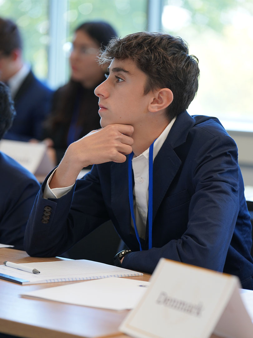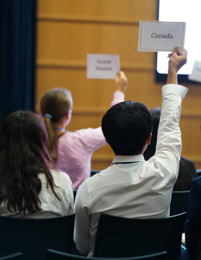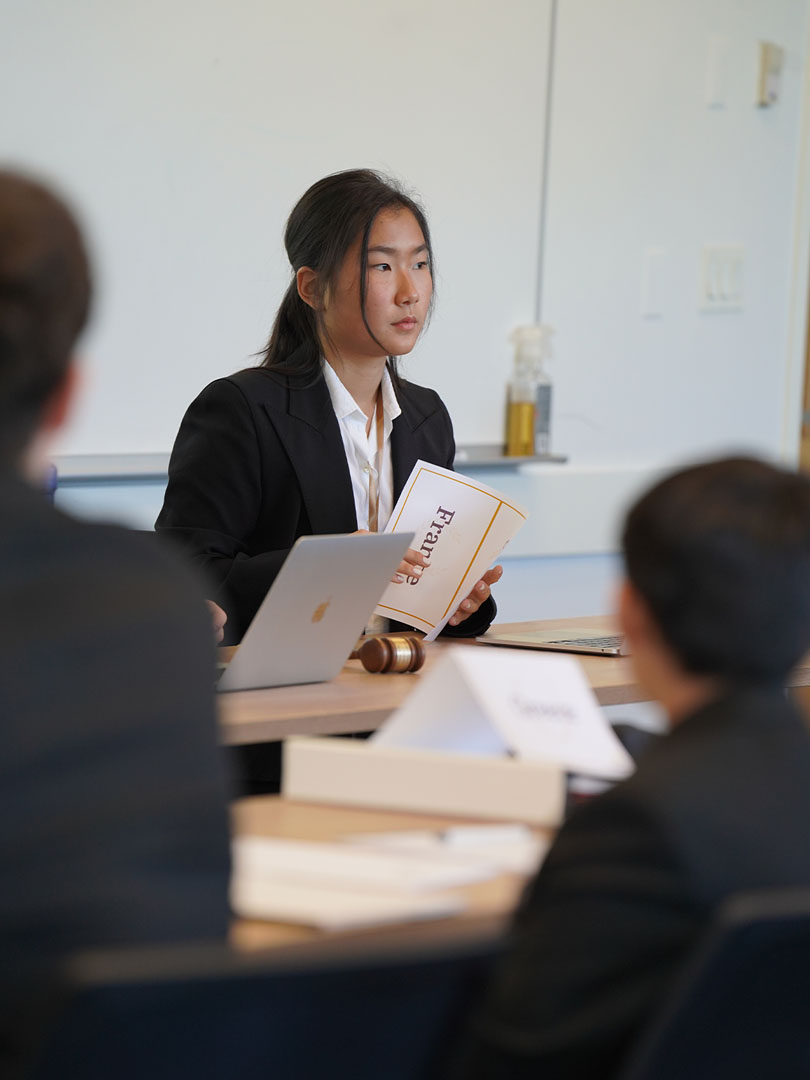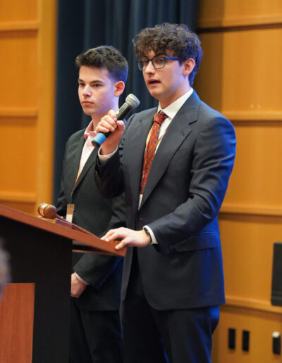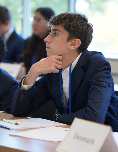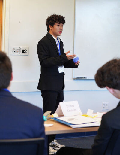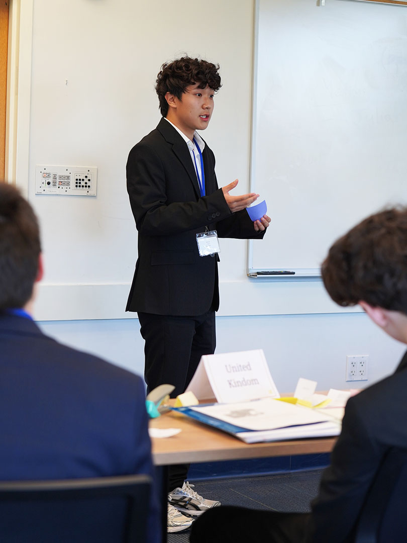D-E’s Model UN Club (D-EMUN) recently hosted six high schools for the annual D-EMUN conference, a two-day event that simulates the research, negotiations, and resolution writing that occur during United Nations summits. Max Koppelman ’26 and Gabriel Rhodes ’26 were Committee Chairs for D-EMUN’s General Assembly, which covered the topics of state-sponsored espionage in peacetime and the regulation of private military contractors in wartime. The Specialized Committees—the White House Situation Room, co-chaired by Alex Rhee ’28 and Ripley Golden ’26; and NATO, co-chaired by Ben Blitz ’26 and Hannah Chun ’27—discussed the Cuban Missile Crisis and the militarization of the Arctic, respectively. In a fun twist, the theme of the Crisis Committee was Squid Game, based on the popular TV show, led by Committee Chairs Hayley Fuld ’26 and Ezra Newman ’26 as well as Crisis Directors Asha Harker ’27 and Nick Bevilacqua ’27. “Our [D-EMUN] Secretariat and senior members have worked incredibly hard to get ready for this event,” said Ms. Baltes, Director of Human Resources, who co-advises the club with Dr. Vendell. All of the conference work is entirely student driven, including extensive background guides for each committee.” According to student leader Max, the conference, which has been in the works for a year, welcomed more than 100 delegates. “D-EMUN has consistently been one of the largest clubs on campus,” he said, noting that the club not only debates complex issues, but also focuses on current events, international diplomacy, and traveling to conferences together. Experiences like this help our students aim to be citizens of the world. And as is also reflective of the D-E mission, all proceeds from candy grams sold during the conference will be donated to the Bergen Family Center.
