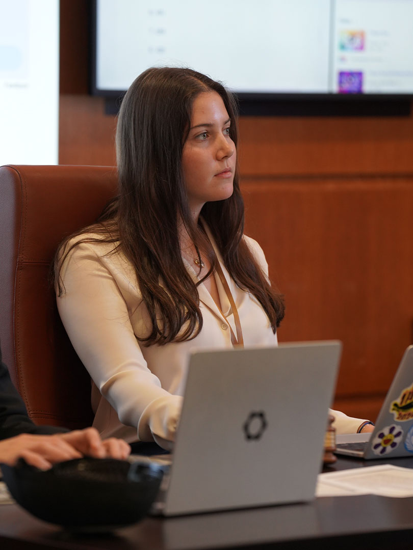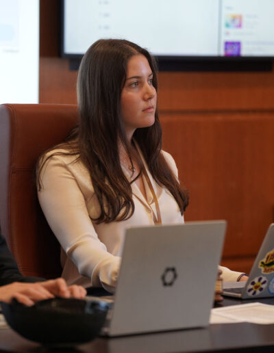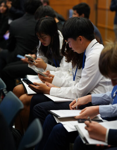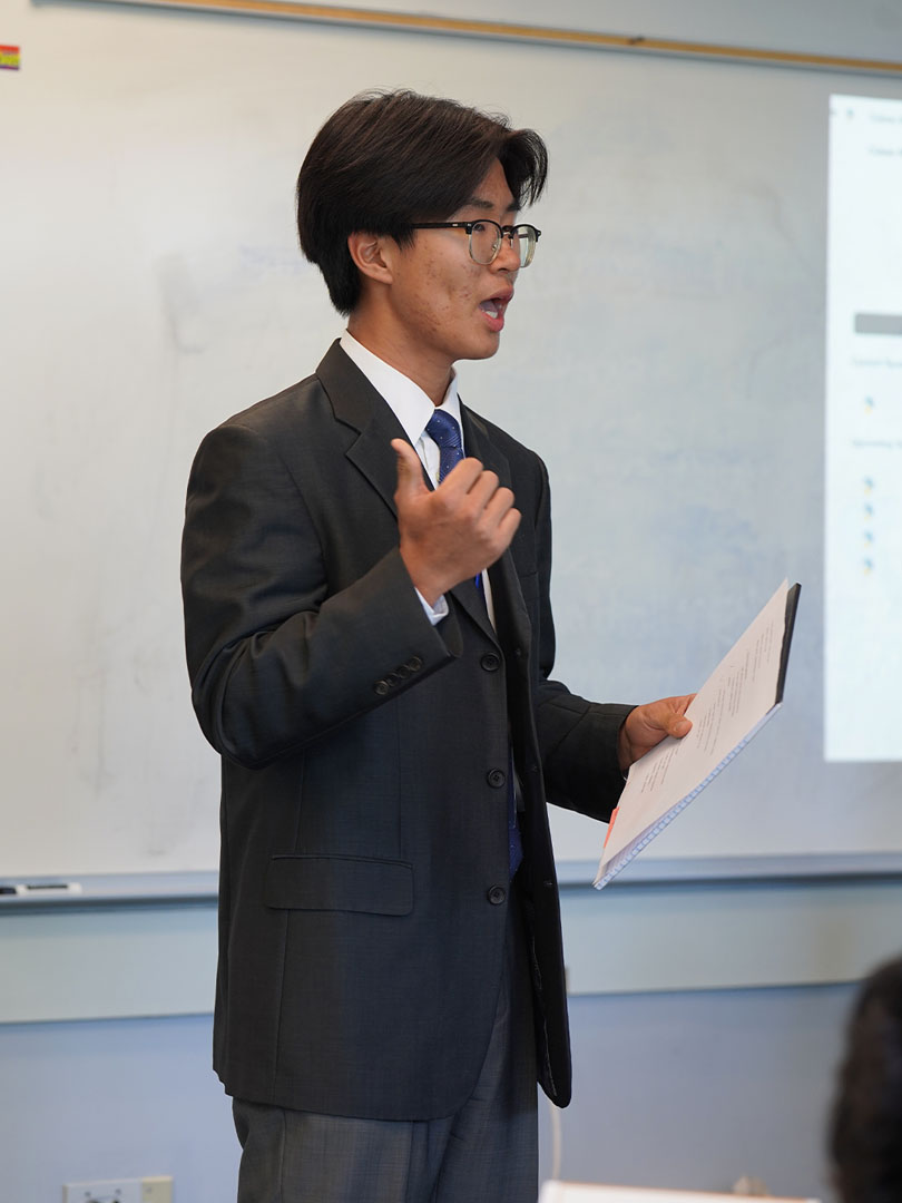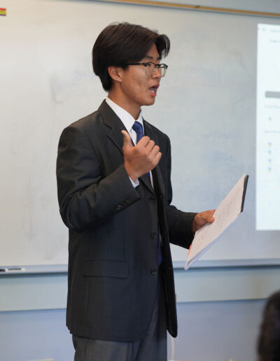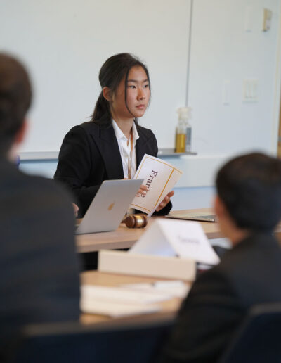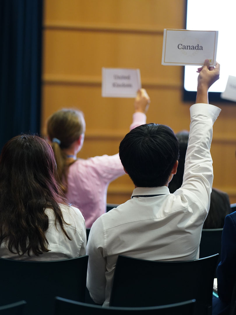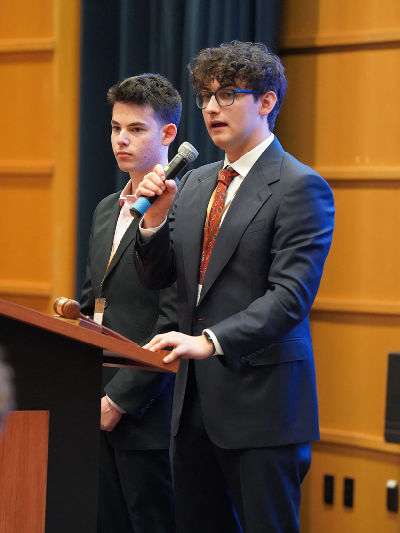 D-E’s Model UN Club (D-EMUN) recently hosted six high schools for the annual D-EMUN conference, a two-day event that simulates the research, negotiations, and resolution writing that occur during United Nations summits. Max Koppelman ’26 and Gabriel Rhodes ’26 were Committee Chairs for D-EMUN’s General Assembly, which covered the topics of state-sponsored espionage in peacetime and the regulation of private military contractors in wartime. The Specialized Committees—the White House Situation Room, co-chaired by Alex Rhee ’28 and Ripley Golden ’26; and NATO, co-chaired by Ben Blitz ’26 and Hannah Chun ’27—discussed the Cuban Missile Crisis and the militarization of the Arctic, respectively. In a fun twist, the theme of the Crisis Committee was Squid Game, based on the popular TV show, led by Committee Chairs Hayley Fuld ’26 and Ezra Newman ’26 as well as Crisis Directors Asha Harker ’27 and Nick Bevilacqua ’27. “Our [D-EMUN] Secretariat and senior members have worked incredibly hard to get ready for this event,” said Ms. Baltes, Director of Human Resources, who co-advises the club with Dr. Vendell. All of the conference work is entirely student driven, including extensive background guides for each committee.” According to student leader Max, the conference, which has been in the works for a year, welcomed more than 100 delegates. “D-EMUN has consistently been one of the largest clubs on campus,” he said, noting that the club not only debates complex issues, but also focuses on current events, international diplomacy, and traveling to conferences together. Experiences like this help our students aim to be citizens of the world. And as is also reflective of the D-E mission, all proceeds from candy grams sold during the conference will be donated to the Bergen Family Center.