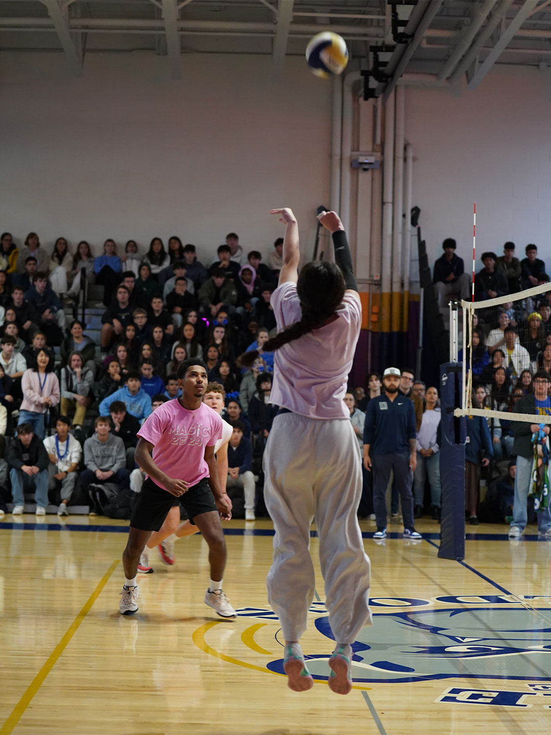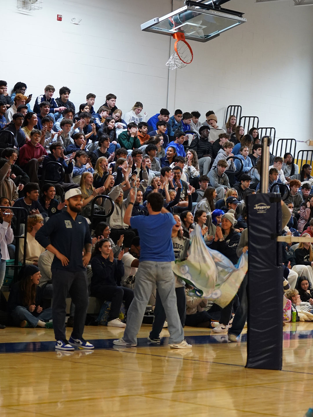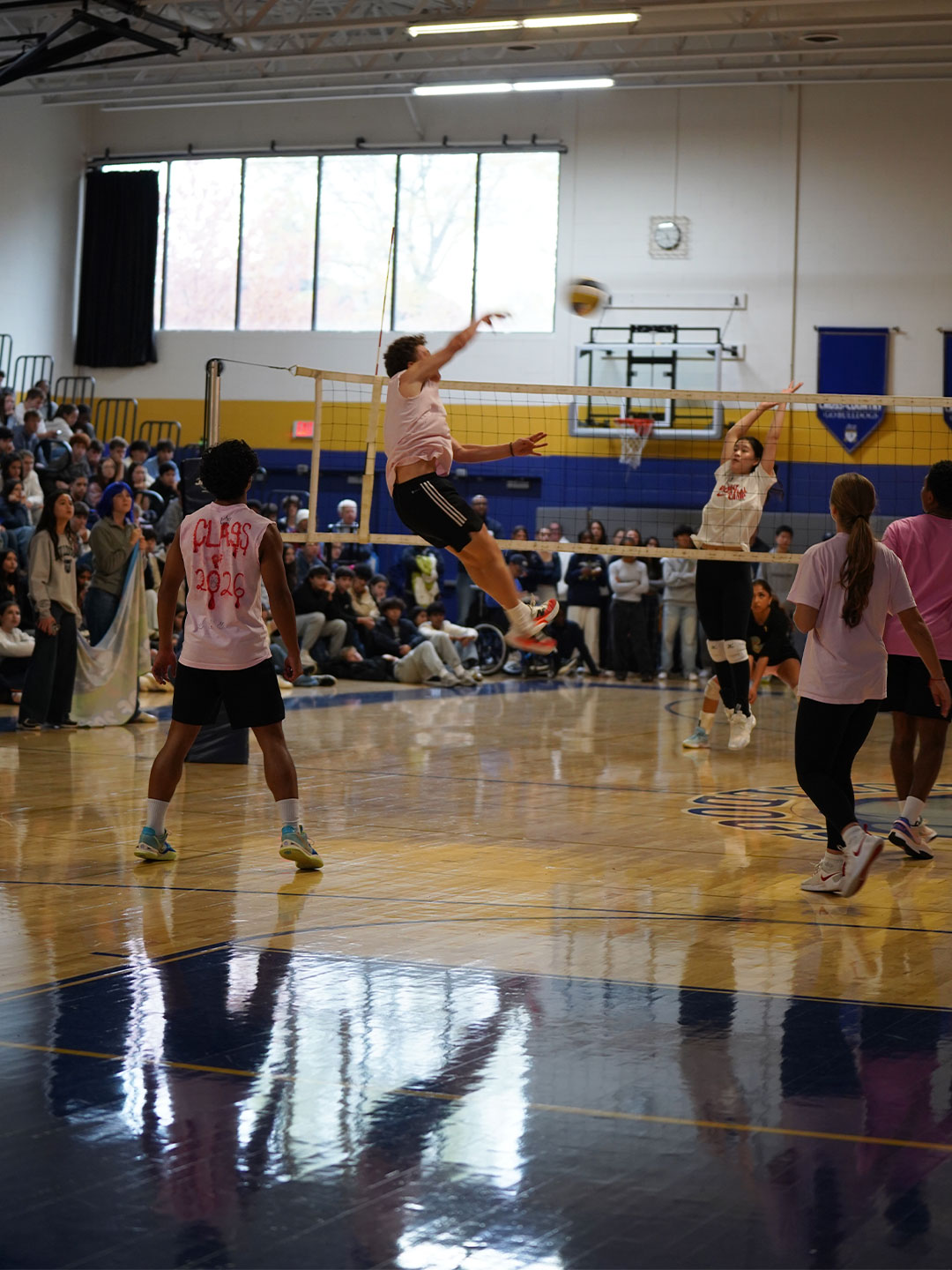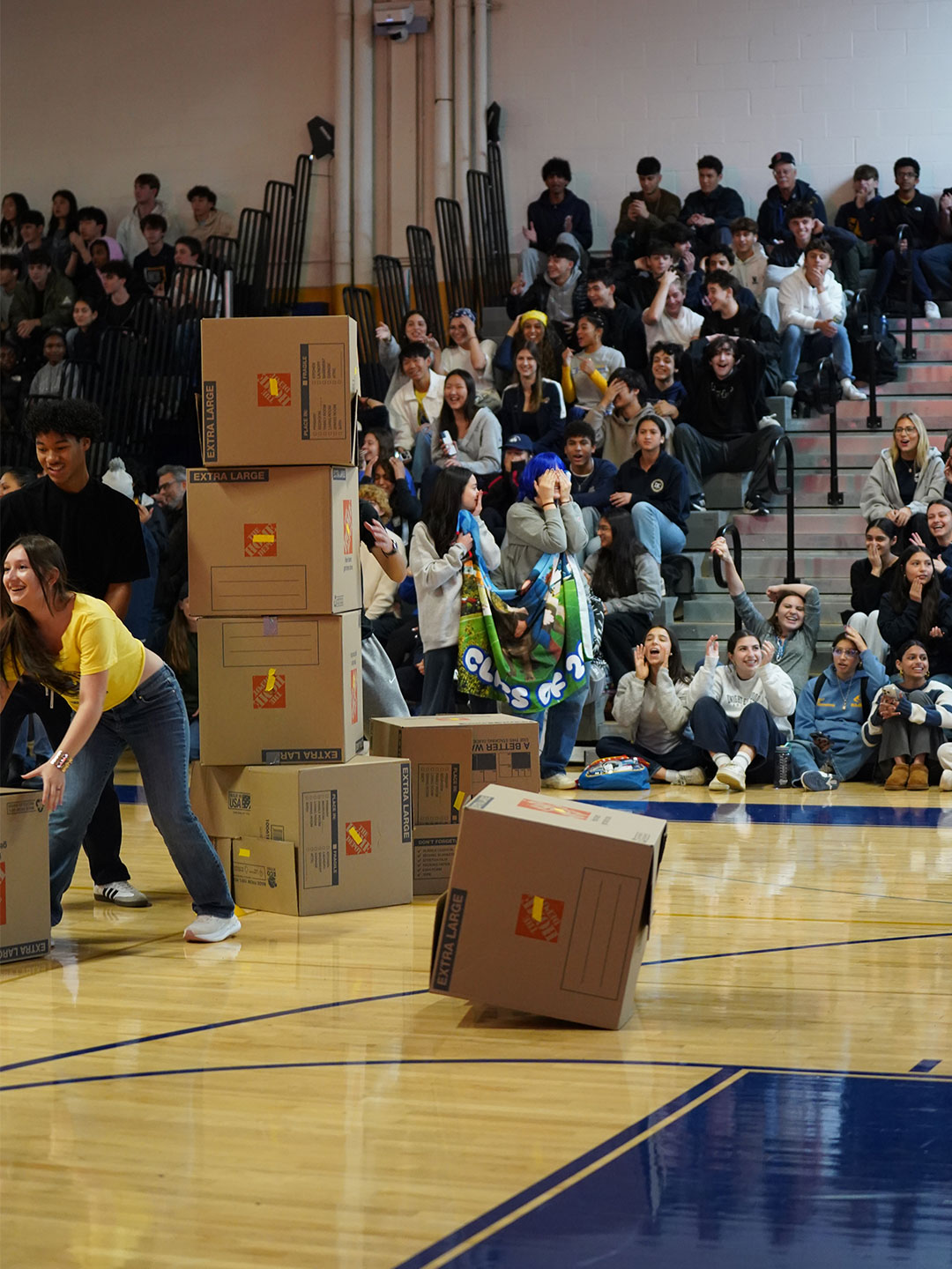 On the fourth day of Spirit Week—D-E Spirit Day—Bulldogs from every division wore their blue, gold, and white proudly! The Upper School’s Spirit Day Assembly kicked off with a lively pep rally and competitive volleyball tournament in the Myrna B. Sherman Gym. Juniors defeated the Freshmen in Round 1, and Seniors knocked out the Sophomores in Round 2 and ultimately beat the Juniors 16 to 9 in the final. During an exciting halftime challenge, the Class of 2028 pulled off the win by being the first to stack seven large cardboard boxes on top of each other. In addition to Coin Wars, students can collect points from a candy jar guessing game, as well as the Programming and Math Challenges of the Week. Keep up the incredible energy, Bulldogs!