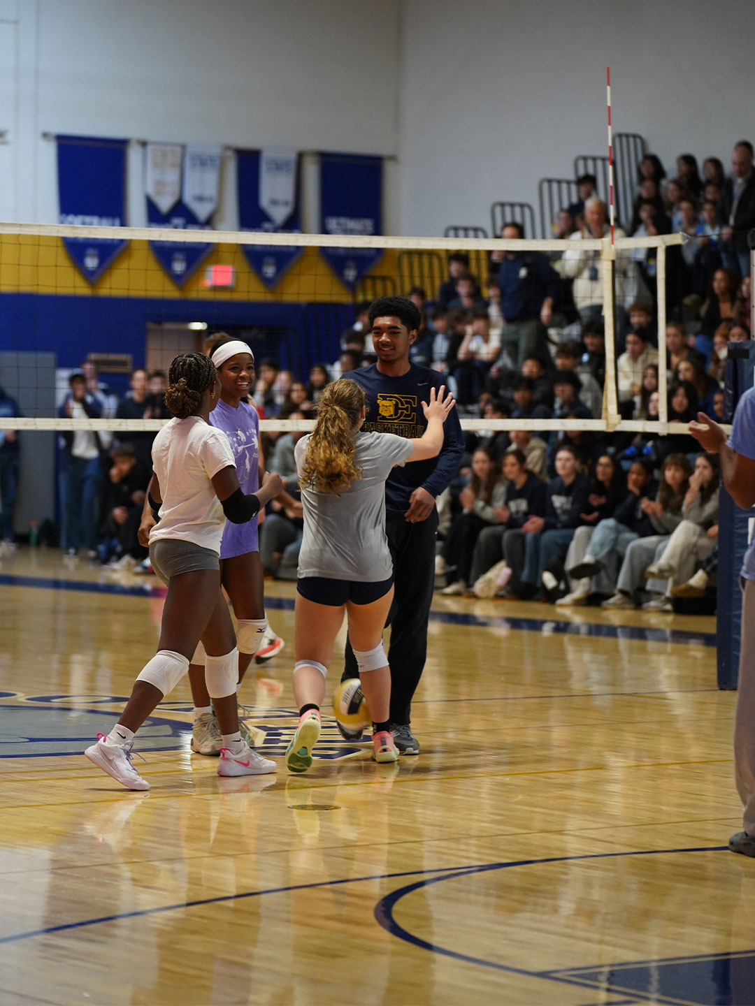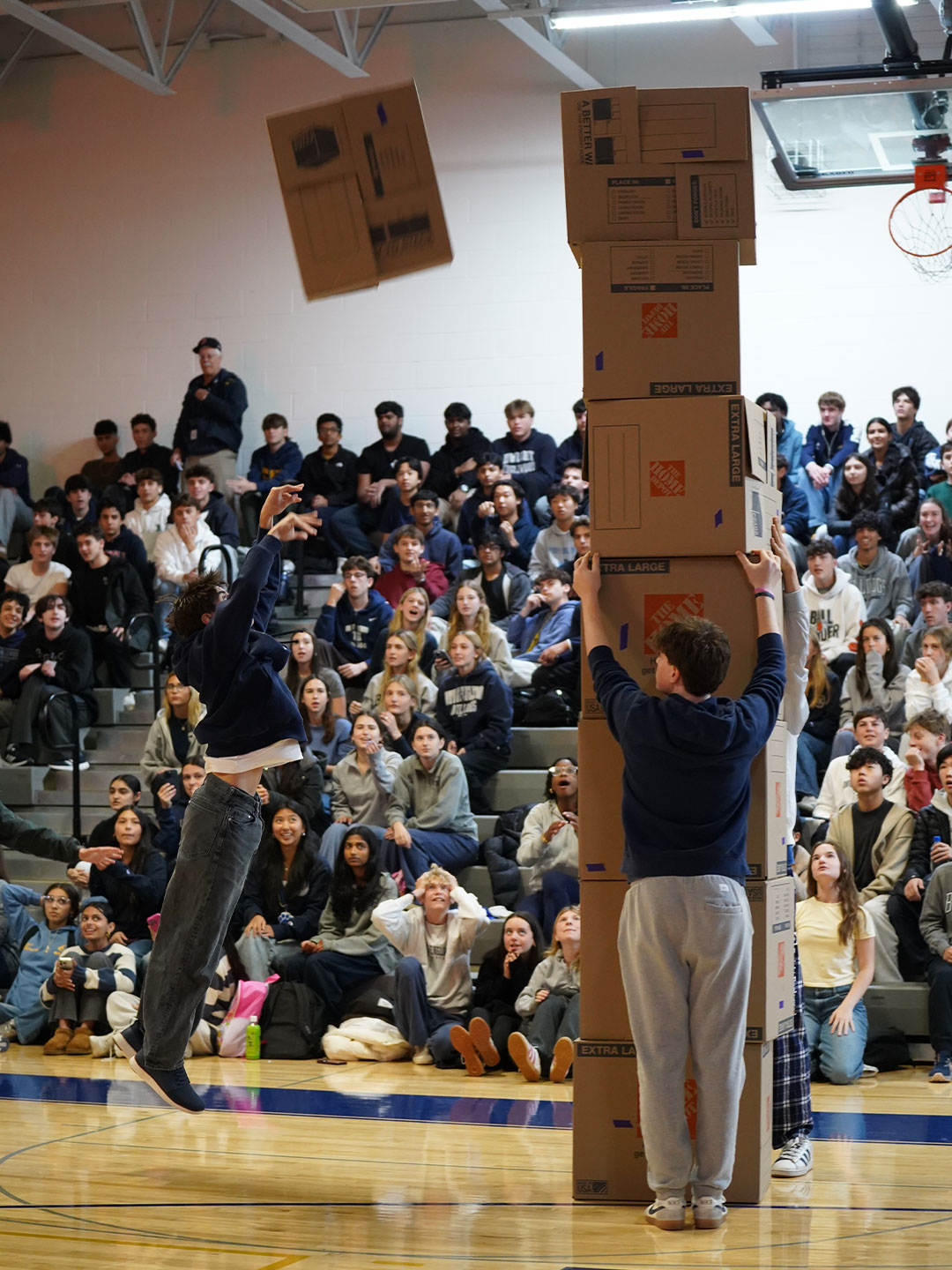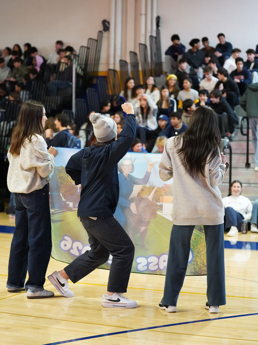 On the fourth day of Spirit Week—D-E Spirit Day—Bulldogs from every division wore their blue, gold, and white proudly! The Upper School’s Spirit Day Assembly kicked off with a lively pep rally and competitive volleyball tournament in the Myrna B. Sherman Gym. Juniors defeated the Freshmen in Round 1, and Seniors knocked out the Sophomores in Round 2 and ultimately beat the Juniors 16 to 9 in the final. During an exciting halftime challenge, the Class of 2028 pulled off the win by being the first to stack seven large cardboard boxes on top of each other. In addition to Coin Wars, students can collect points from a candy jar guessing game, as well as the Programming and Math Challenges of the Week. Keep up the incredible energy, Bulldogs!