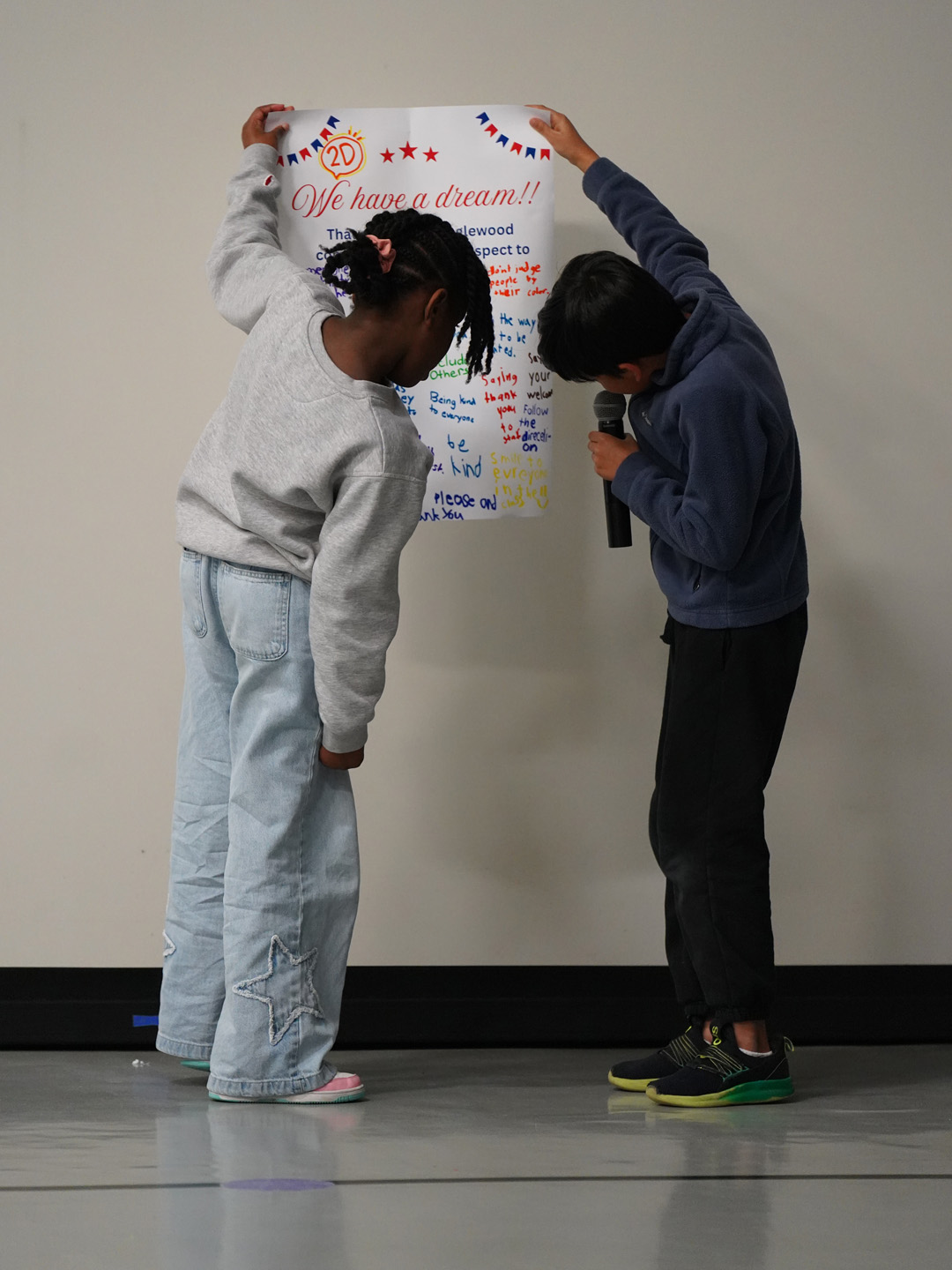 D-E honored Dr. Martin Luther King Jr. across divisions. During the Lower School (LS) Assembly on Wednesday, students from each LS grade spoke beautifully about how MLK’s dream of racial harmony and equal justice connects to our School’s core values of community, courage, judgment, commitment, respect, and honesty. The Middle School (MS) Assembly took place on Dr. King’s actual birthday, Jan. 15. Ms. Simone Henry Agblonon, Assistant Director of Diversity, Equity, Inclusion & Belonging (LS/MS), engaged MS students in a lively Q&A after a video on the history of MLK Jr. Day that segued into a thoughtful discussion on Dr. King’s legacy. Students also celebrated the occasion with a slice of “birthday cake” on the MS porches.