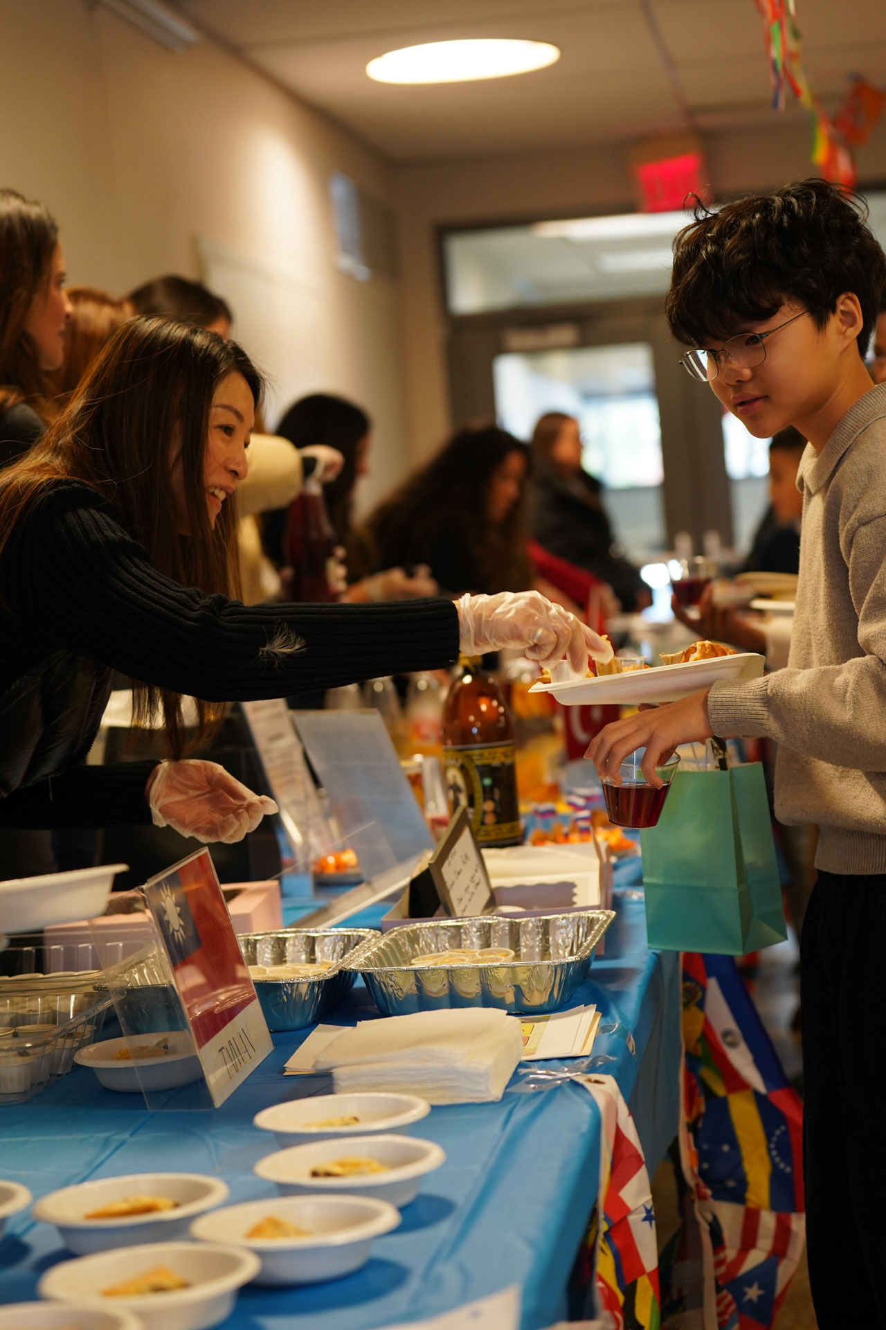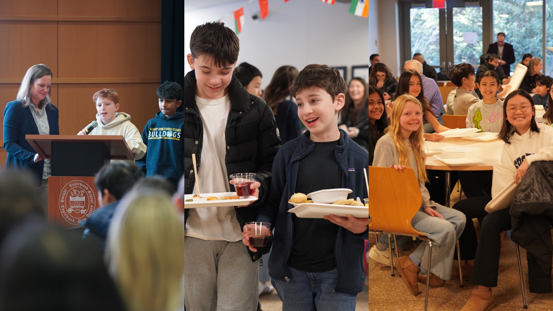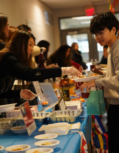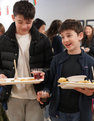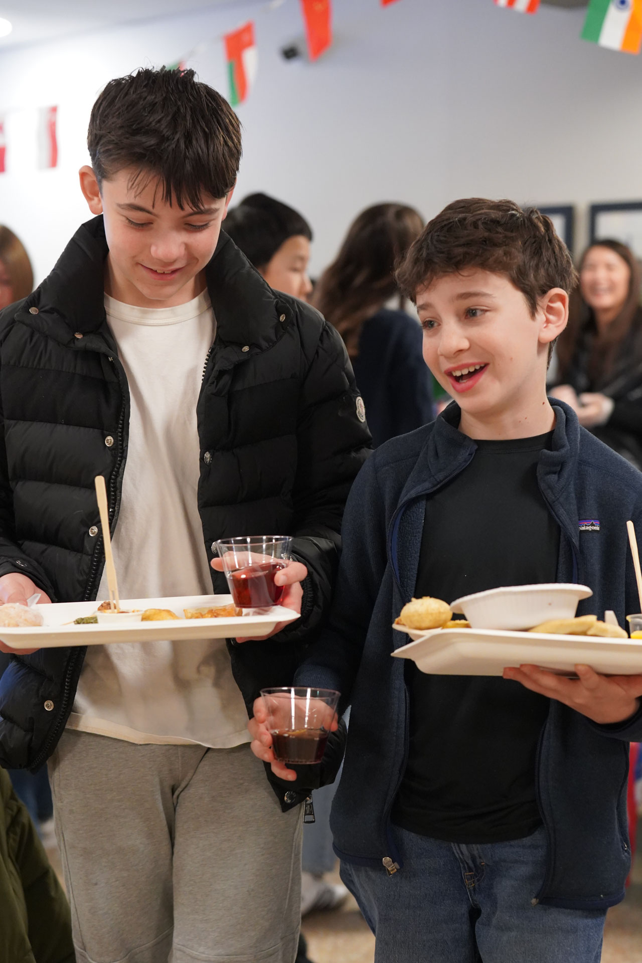 In a culmination of the Sixth Grade Food & Identity Unit that began two weeks ago, students presented their hard work across their MESH (Math, English, Science, and History) classes to D-E families in Hajjar Auditorium, followed by a food-tasting celebration facilitated by parent volunteers. The presentations included essays and slideshows about meals that are culturally significant to individual students, data graphs based on their respective food logs, and infographics representing the origin of ingredients. The unit showed how foods can serve as a bridge between different cultures. This was further demonstrated during the festival in the Wharton Lessin Dining Hall, which featured multicultural bites and beverages. English Teacher Ms. Macone, who leads the unit, encouraged students to try new recipes, learn more about different traditions, and appreciate one another. In a full-circle moment, after having introduced the program with meals that represented their own traditions, members of Chef Alex’s catering staff were invited to sample the offerings along with students and families. Congrats to our Middle School for celebrating diversity through cuisine!