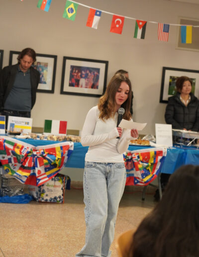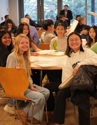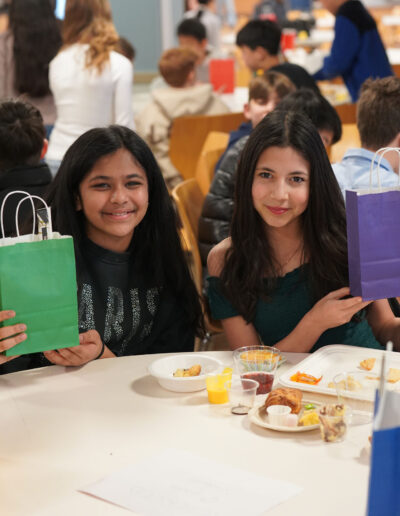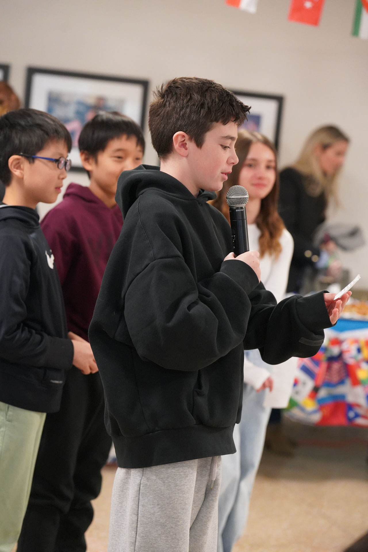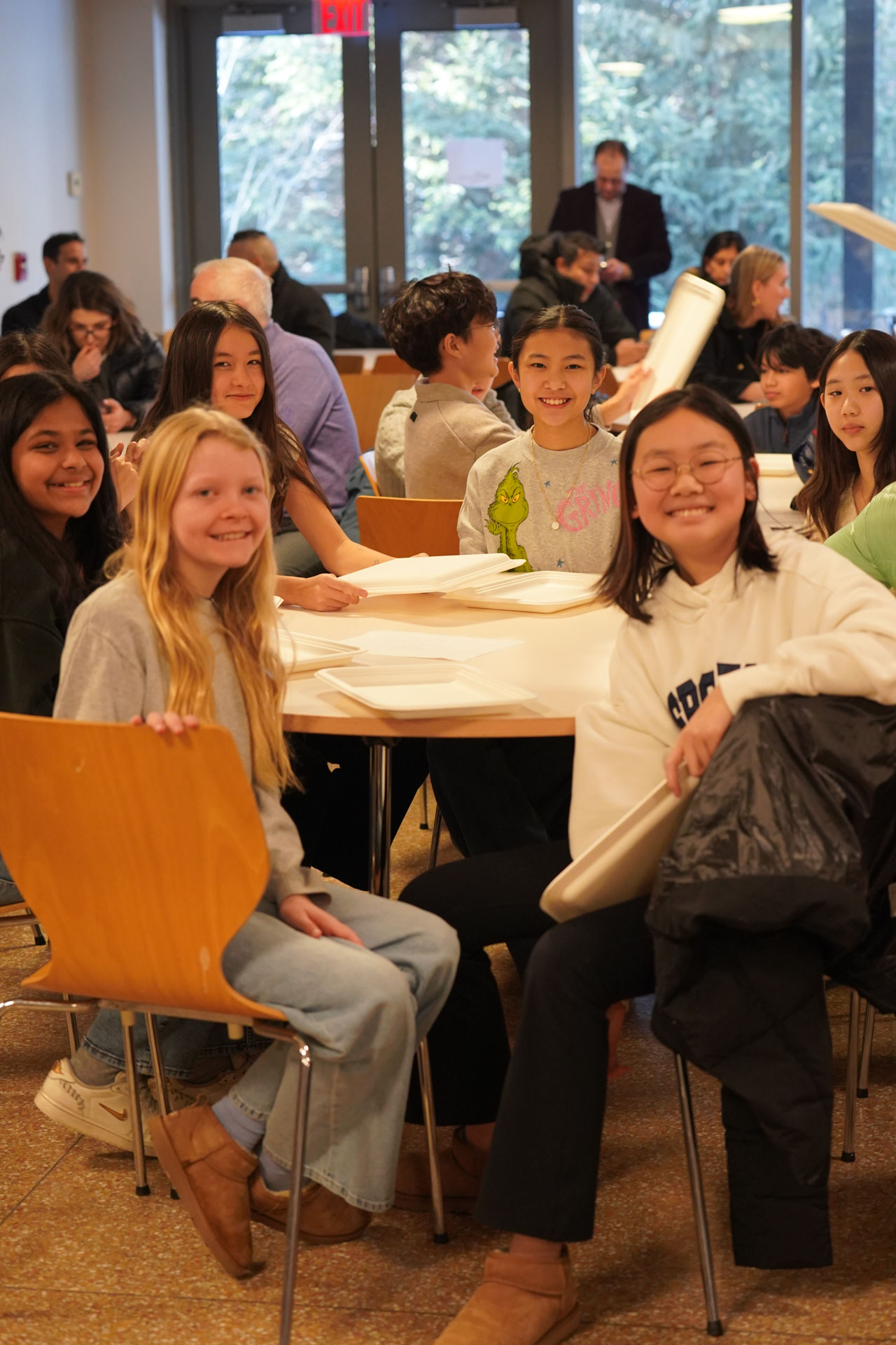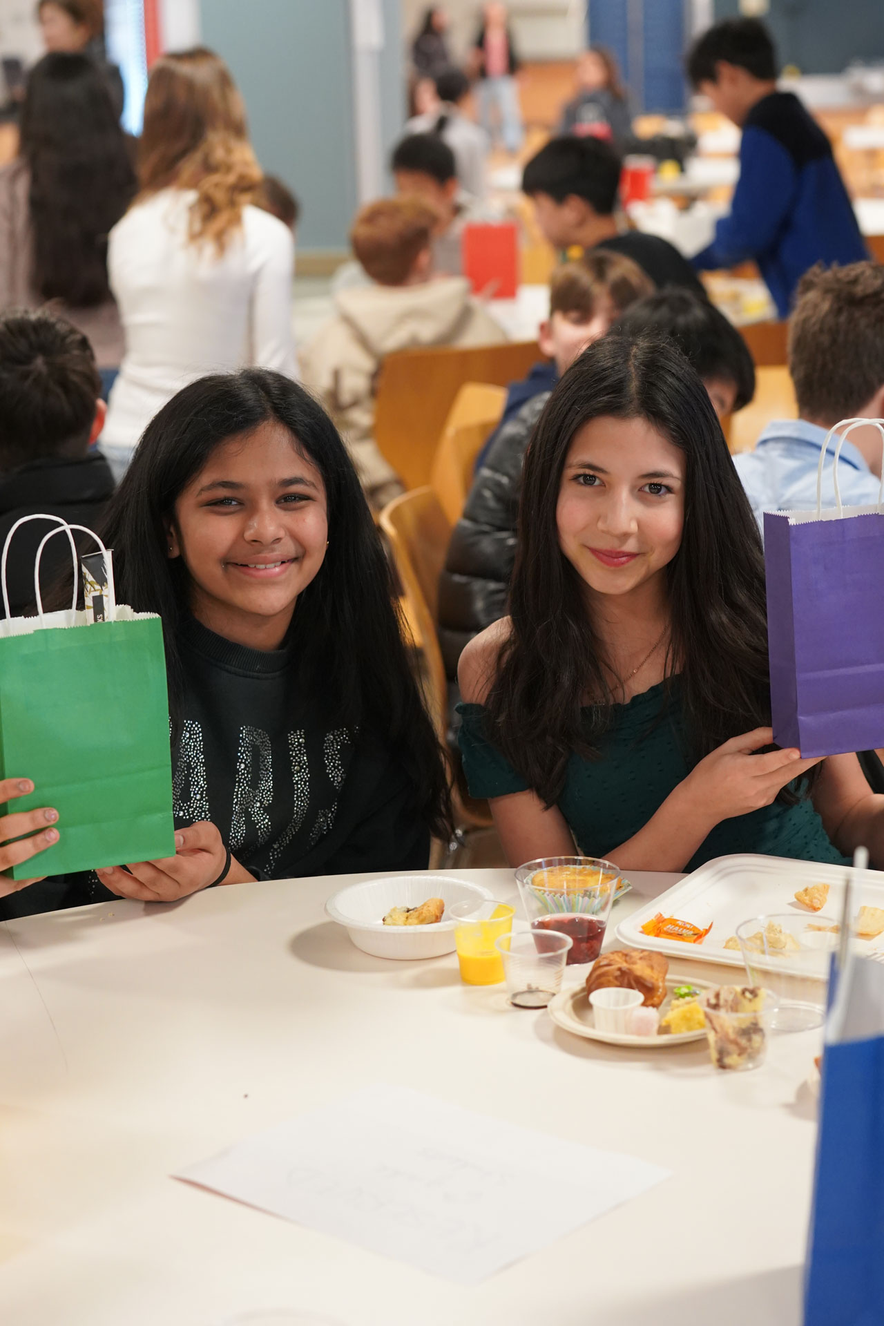 In a culmination of the Sixth Grade Food & Identity Unit that began two weeks ago, students presented their hard work across their MESH (Math, English, Science, and History) classes to D-E families in Hajjar Auditorium, followed by a food-tasting celebration facilitated by parent volunteers. The presentations included essays and slideshows about meals that are culturally significant to individual students, data graphs based on their respective food logs, and infographics representing the origin of ingredients. The unit showed how foods can serve as a bridge between different cultures. This was further demonstrated during the festival in the Wharton Lessin Dining Hall, which featured multicultural bites and beverages. English Teacher Ms. Macone, who leads the unit, encouraged students to try new recipes, learn more about different traditions, and appreciate one another. In a full-circle moment, after having introduced the program with meals that represented their own traditions, members of Chef Alex’s catering staff were invited to sample the offerings along with students and families. Congrats to our Middle School for celebrating diversity through cuisine!