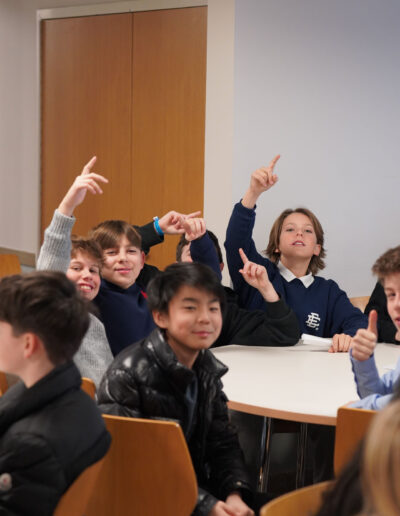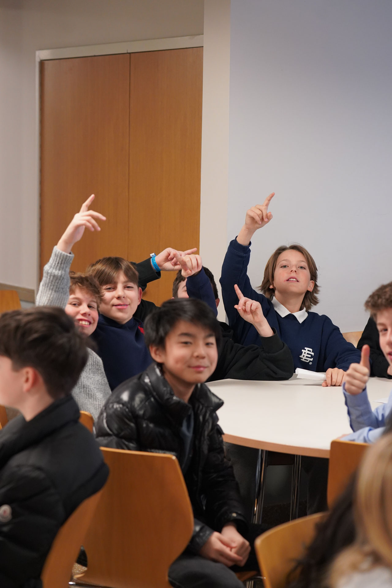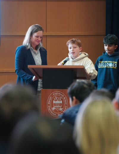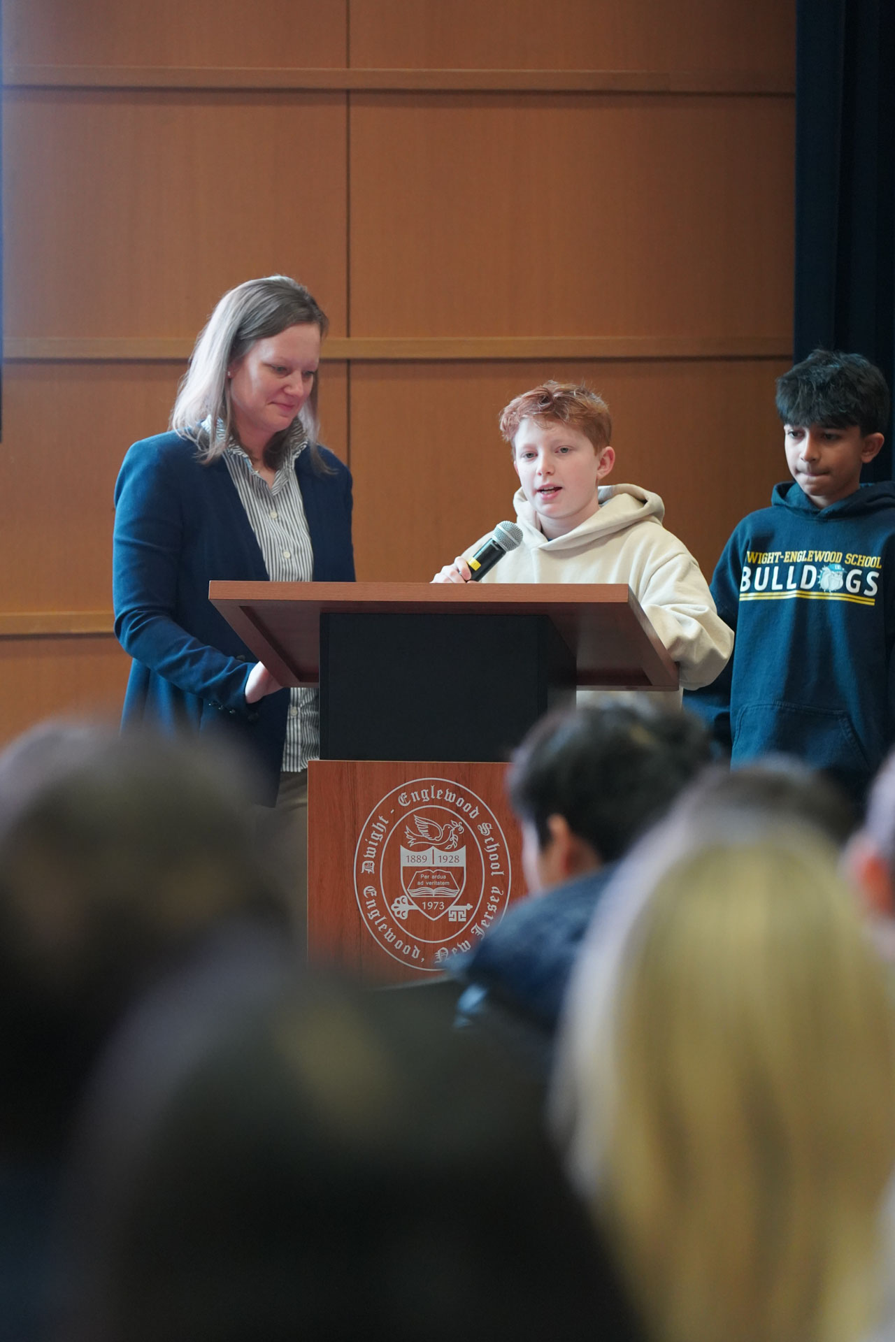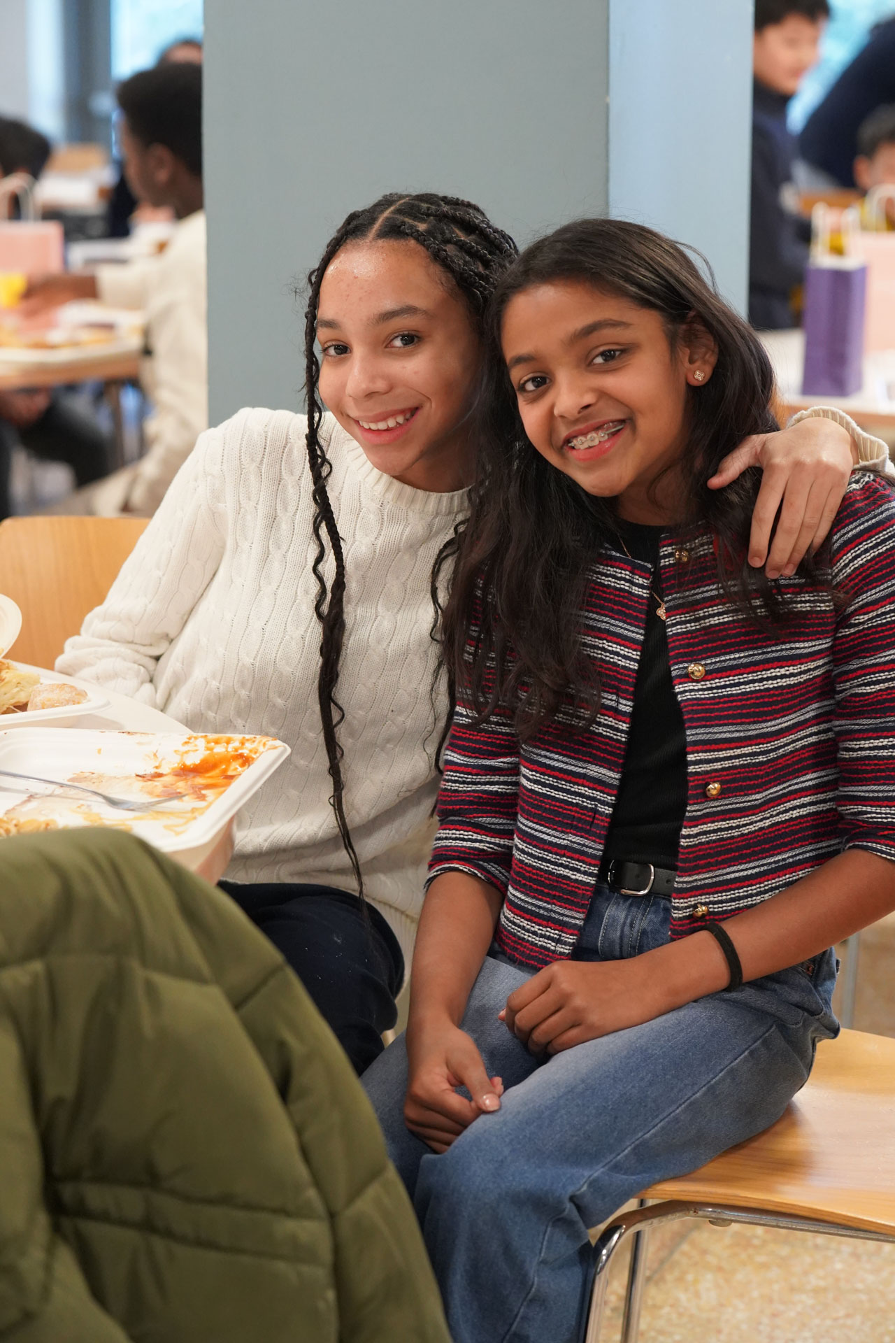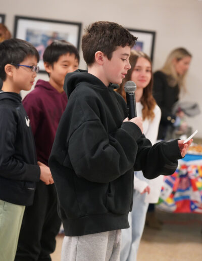 In a culmination of the Sixth Grade Food & Identity Unit that began two weeks ago, students presented their hard work across their MESH (Math, English, Science, and History) classes to D-E families in Hajjar Auditorium, followed by a food-tasting celebration facilitated by parent volunteers. The presentations included essays and slideshows about meals that are culturally significant to individual students, data graphs based on their respective food logs, and infographics representing the origin of ingredients. The unit showed how foods can serve as a bridge between different cultures. This was further demonstrated during the festival in the Wharton Lessin Dining Hall, which featured multicultural bites and beverages. English Teacher Ms. Macone, who leads the unit, encouraged students to try new recipes, learn more about different traditions, and appreciate one another. In a full-circle moment, after having introduced the program with meals that represented their own traditions, members of Chef Alex’s catering staff were invited to sample the offerings along with students and families. Congrats to our Middle School for celebrating diversity through cuisine!