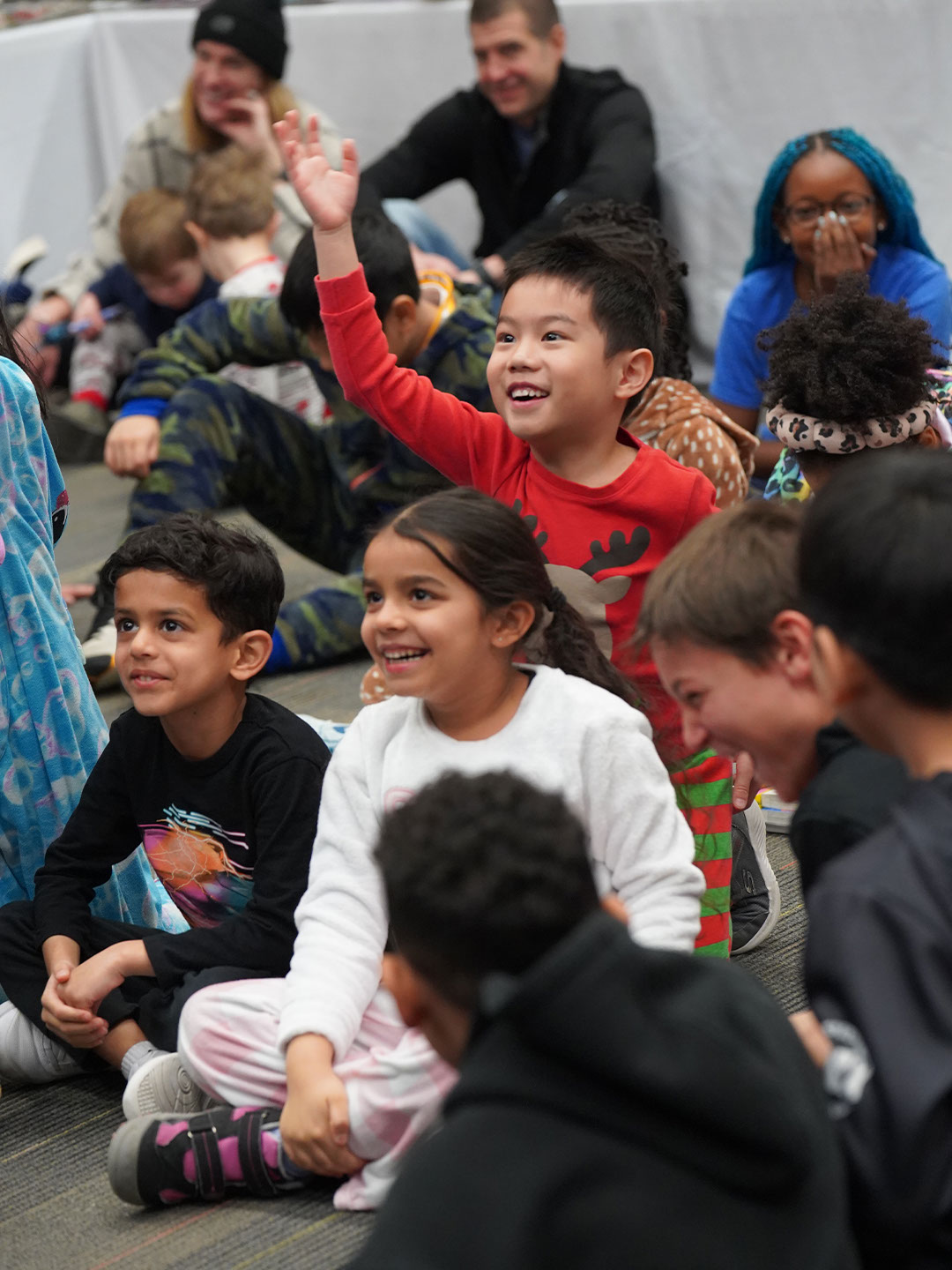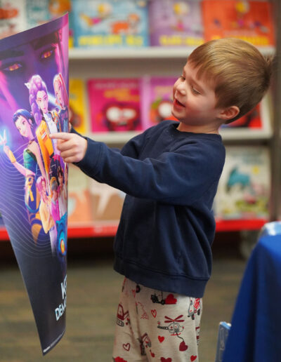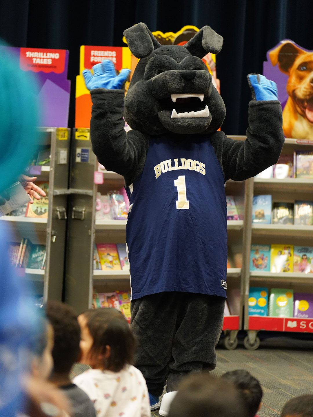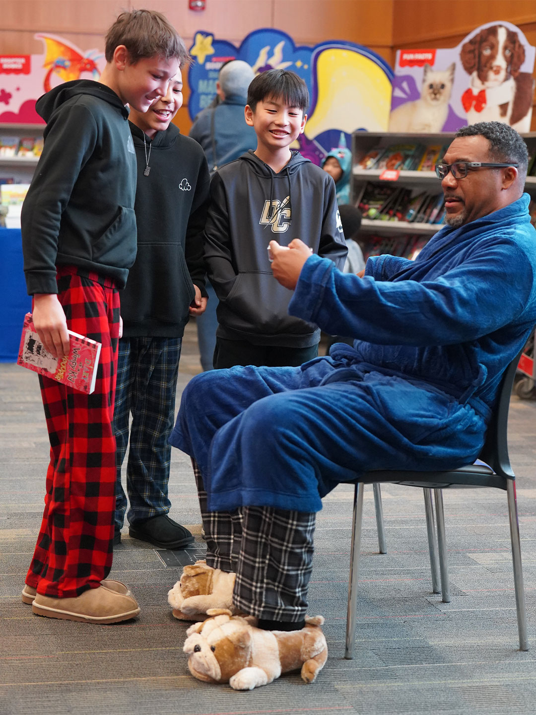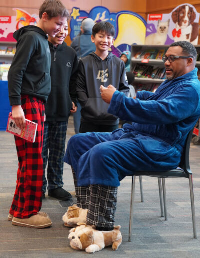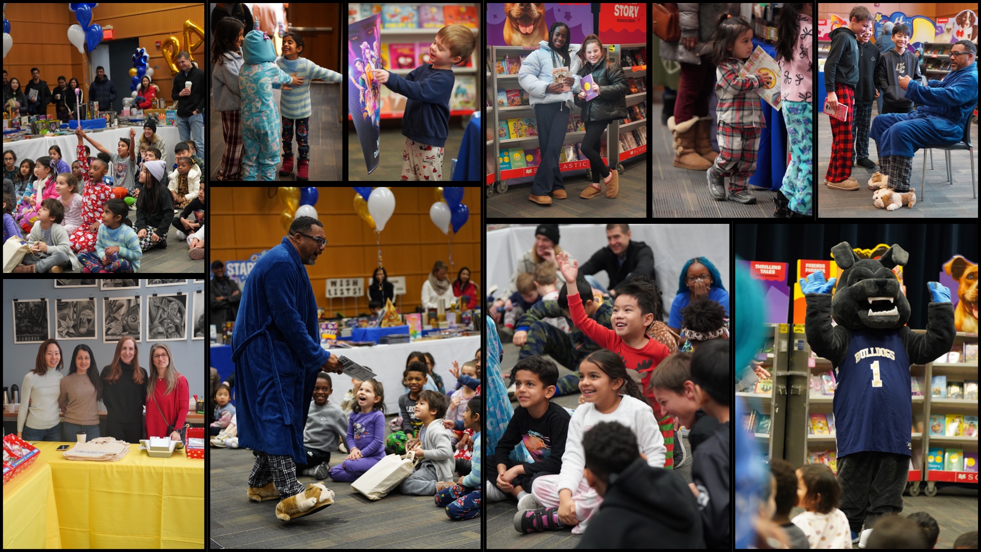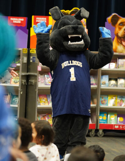 Paws for reading! Our Lower & Middle School Book Fair, hosted by our incredibly D-Edicated Parents’ Association, kicked off in grand fashion. On Saturday, Lower School (LS) students wore their comfy clothes for a PJ Party in Hajjar Auditorium, where Head of School “Dr. CW” dropped by, donning a Bulldog PJ set, blue robe, and Bulldog slippers, to read aloud “This Is a Terrible Book: Will You Help Me Fix It?” by Megan West. LS Principal Mr. Choi, clad in a Bulldog onesie, and Ace, our Bulldog mascot, also joined in the fun! Students will continue browsing and shopping tomorrow during school hours. We hope they find several good reads to cuddle up with this winter!
