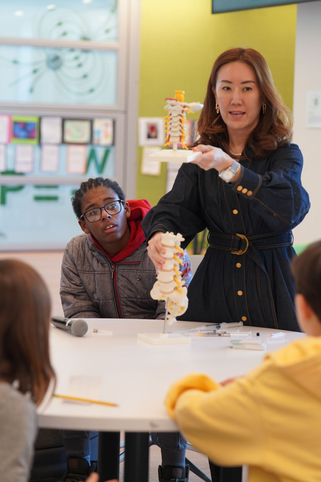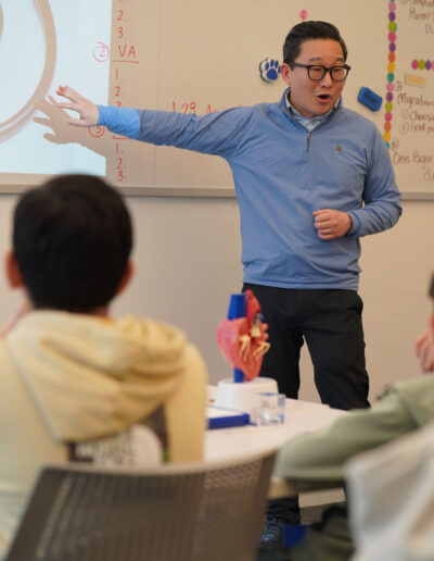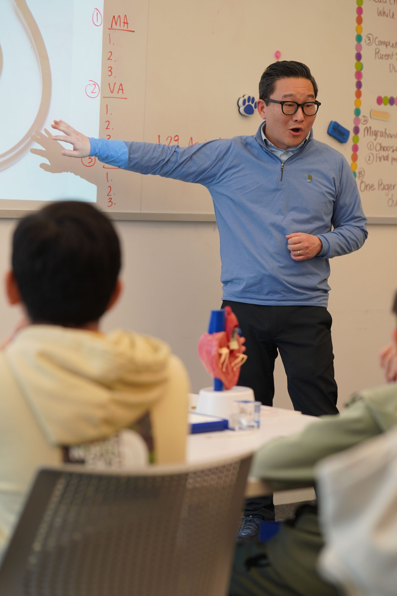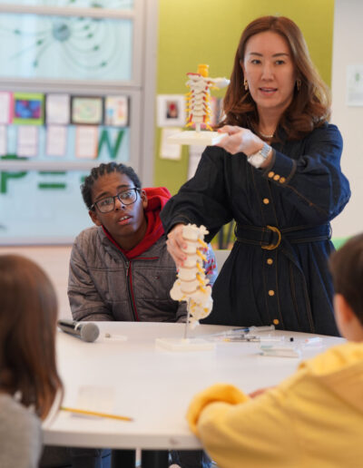 To launch its Anatomy of a Human Project, 7th grade faculty recently facilitated an Anatomy of Human Consortium, during which several D-E parents graciously took time out of their busy days in the medical field to visit the Middle School and share about their medical specialties. Dr. Robert Vitti (Ophthalmology), Dr. Michael Cho (Cardiology), Dr. Zeyad Baker (Pediatrics), Dr. Maya Fakhoury (Nephrology), Dr. Alizabeth Acevedo (Anesthesiology), Dr. Jaehon Kim (Orthopedics), and Dr. Ruby Kim (Pain Management) brought in anatomical models to assist in their interactive presentations. Students were locked in during the individual sessions and asked astute questions. “As a team, we felt this was a meaningful way for students to learn from real professionals in our community and generate excitement for the upcoming project,” said Mr. Larrowe P’30, P’32, 7th Grade Science Teacher & Team Leader. The project, which culminates in an exhibition open to all D-E families, is interdisciplinary, combining their study of body systems with literary characters, data, and historical analyses based on “The Distance Between Us,” a memoir by Reyna Grande. Kudos to our 7th graders for their rapt attention and engagement while learning about the wonders of the human body!