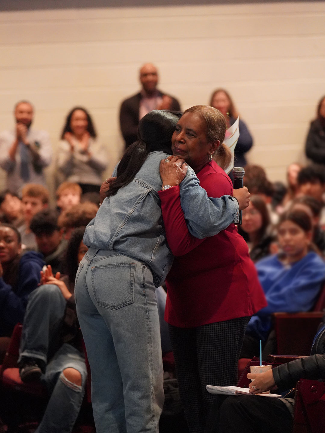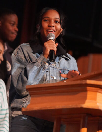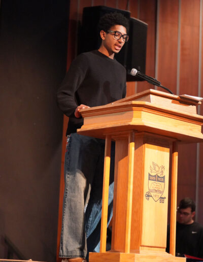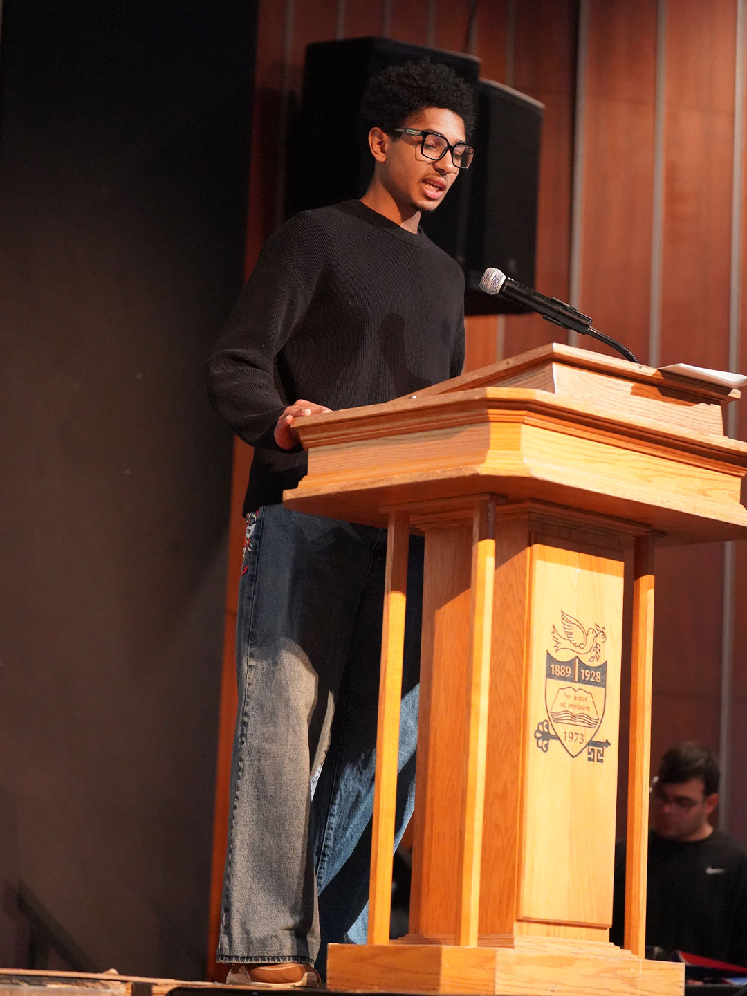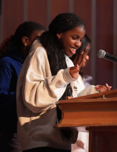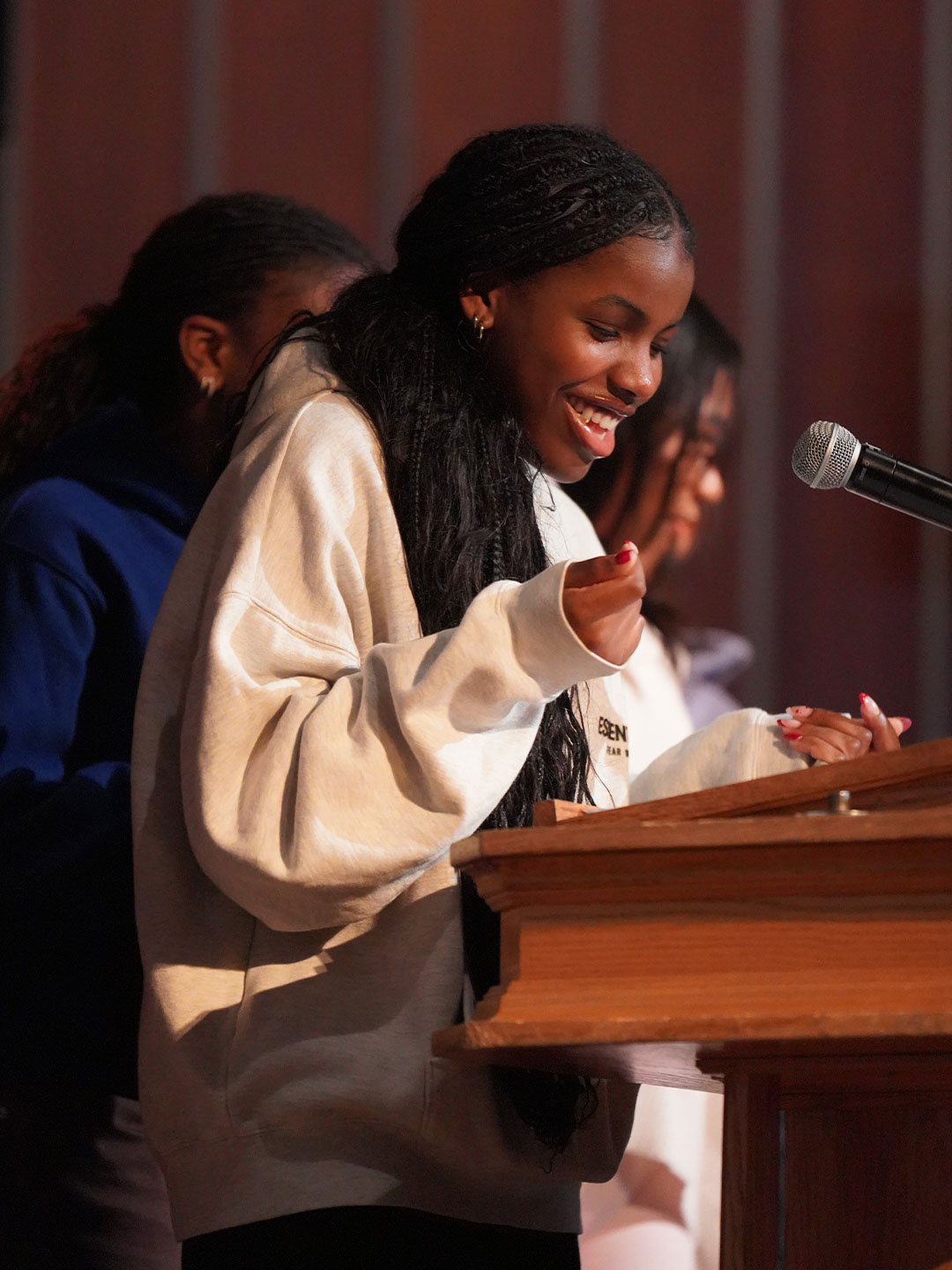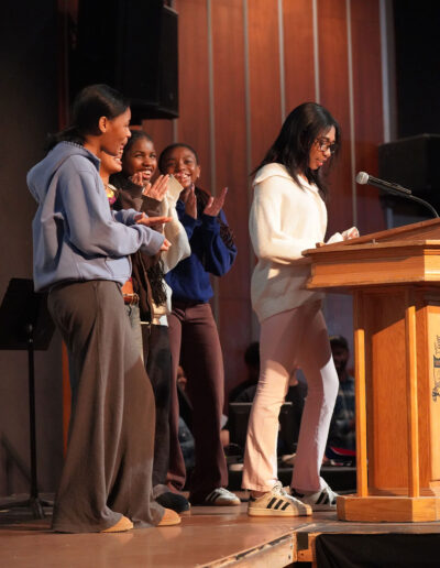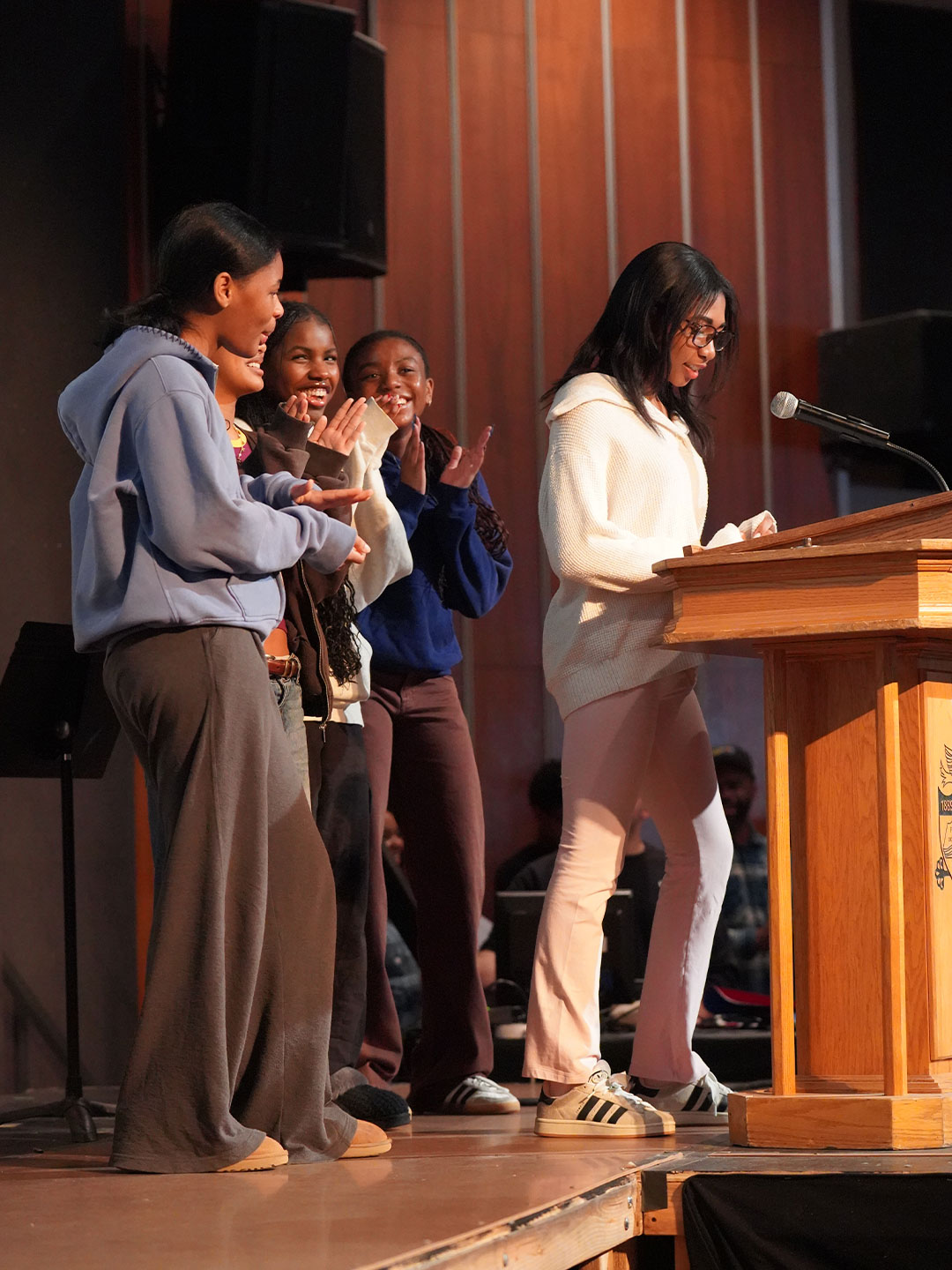 Black History Month celebrations continued this week in the Middle and Upper Schools with assemblies in Schenck Auditorium facilitated by the Diversity, Equity, Inclusion & Belonging (DEIB) Department. For the US Assembly, members of the Black Affinity student organization spoke on the focus of “celebrating both the struggle and strength” of Black Americans, provided a history of the annual observation, reflected on the harm that microaggressions cause historically marginalized people, and engaged the audience in two rounds of trivia based on songs from Black artists and general knowledge about Black history, respectively. Other notable moments included Sade Adeyeri ’28 and Simone Williams ’28 sharing personal stories about their Afro-Latina mixed heritages and a sweet acknowledgement of long-time US English Teacher Diane Christian’s impending retirement. To close the assembly, members of the Jazz Rock ensemble performed “Ain’t No Mountain High Enough Song,” by Marvin Gaye and Tammi Terrell, and Black Affinity members remarked on the importance of “embracing the diversity of our stories and experiences.”