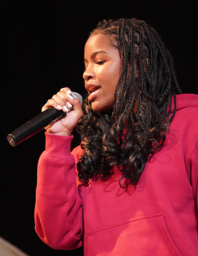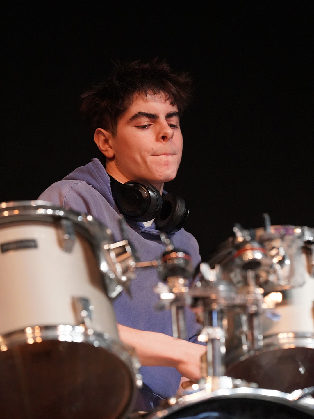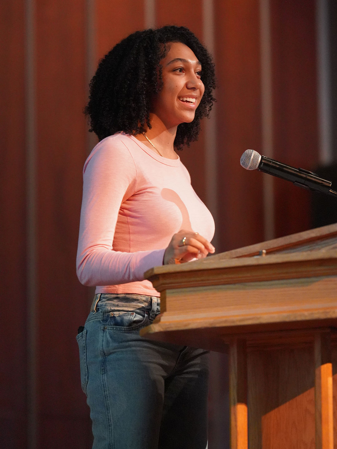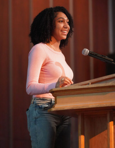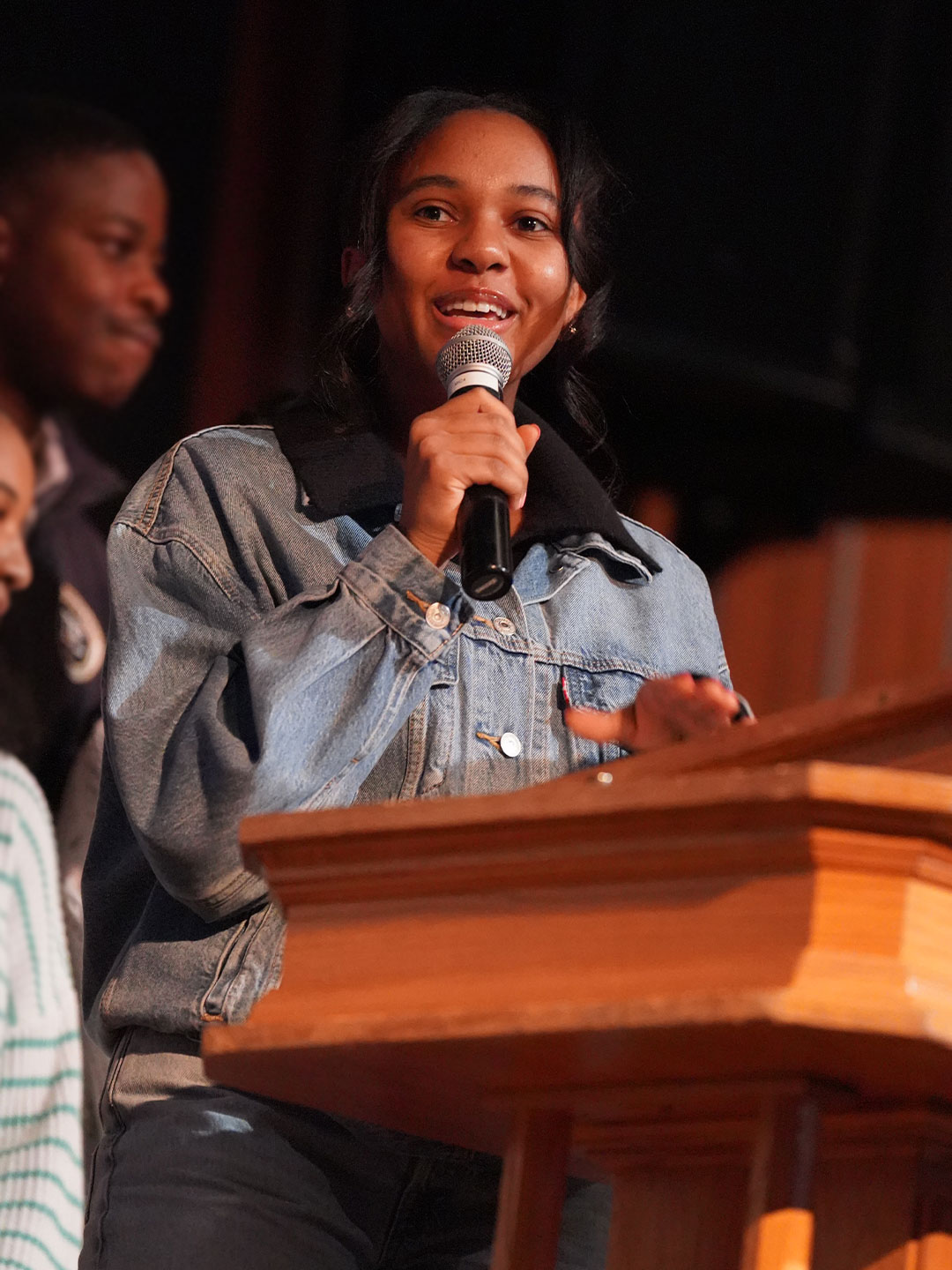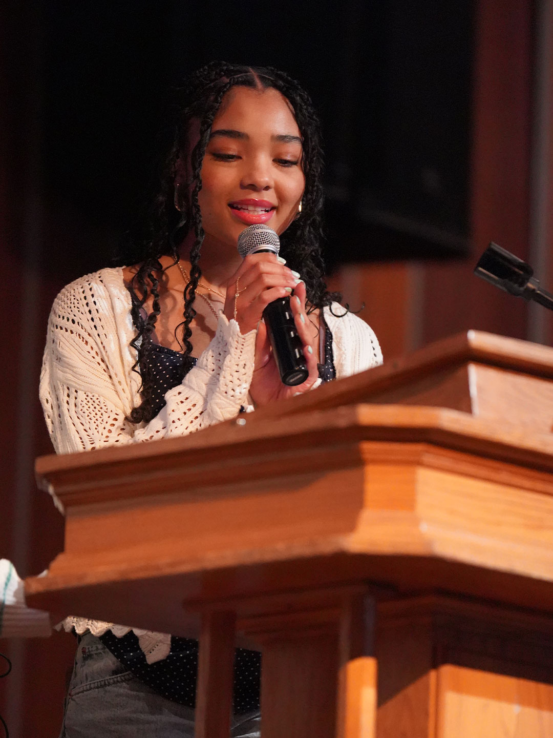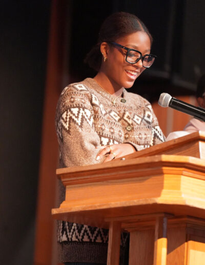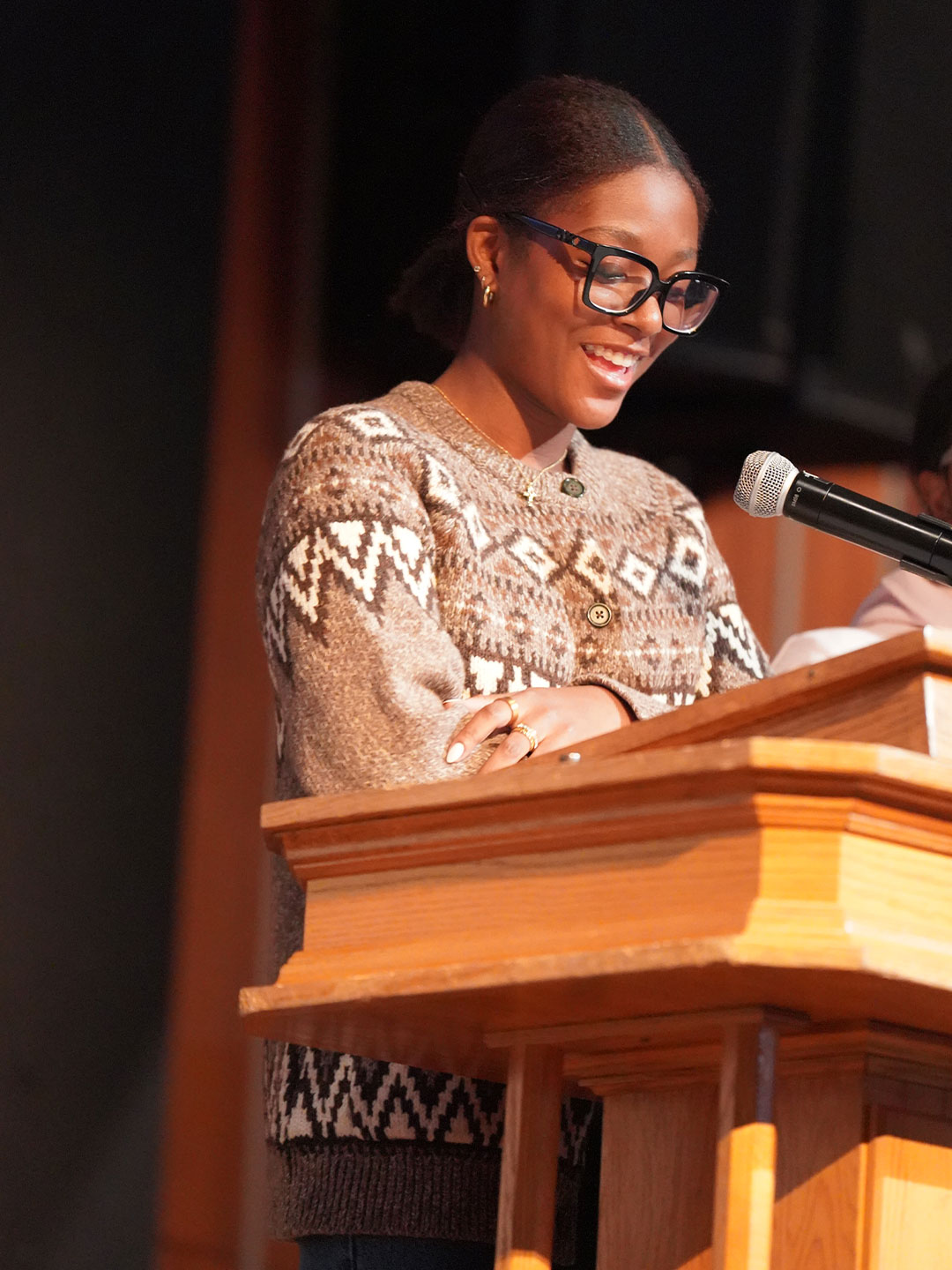 Black History Month celebrations continued this week in the Middle and Upper Schools with assemblies in Schenck Auditorium facilitated by the Diversity, Equity, Inclusion & Belonging (DEIB) Department. For the US Assembly, members of the Black Affinity student organization spoke on the focus of “celebrating both the struggle and strength” of Black Americans, provided a history of the annual observation, reflected on the harm that microaggressions cause historically marginalized people, and engaged the audience in two rounds of trivia based on songs from Black artists and general knowledge about Black history, respectively. Other notable moments included Sade Adeyeri ’28 and Simone Williams ’28 sharing personal stories about their Afro-Latina mixed heritages and a sweet acknowledgement of long-time US English Teacher Diane Christian’s impending retirement. To close the assembly, members of the Jazz Rock ensemble performed “Ain’t No Mountain High Enough Song,” by Marvin Gaye and Tammi Terrell, and Black Affinity members remarked on the importance of “embracing the diversity of our stories and experiences.”