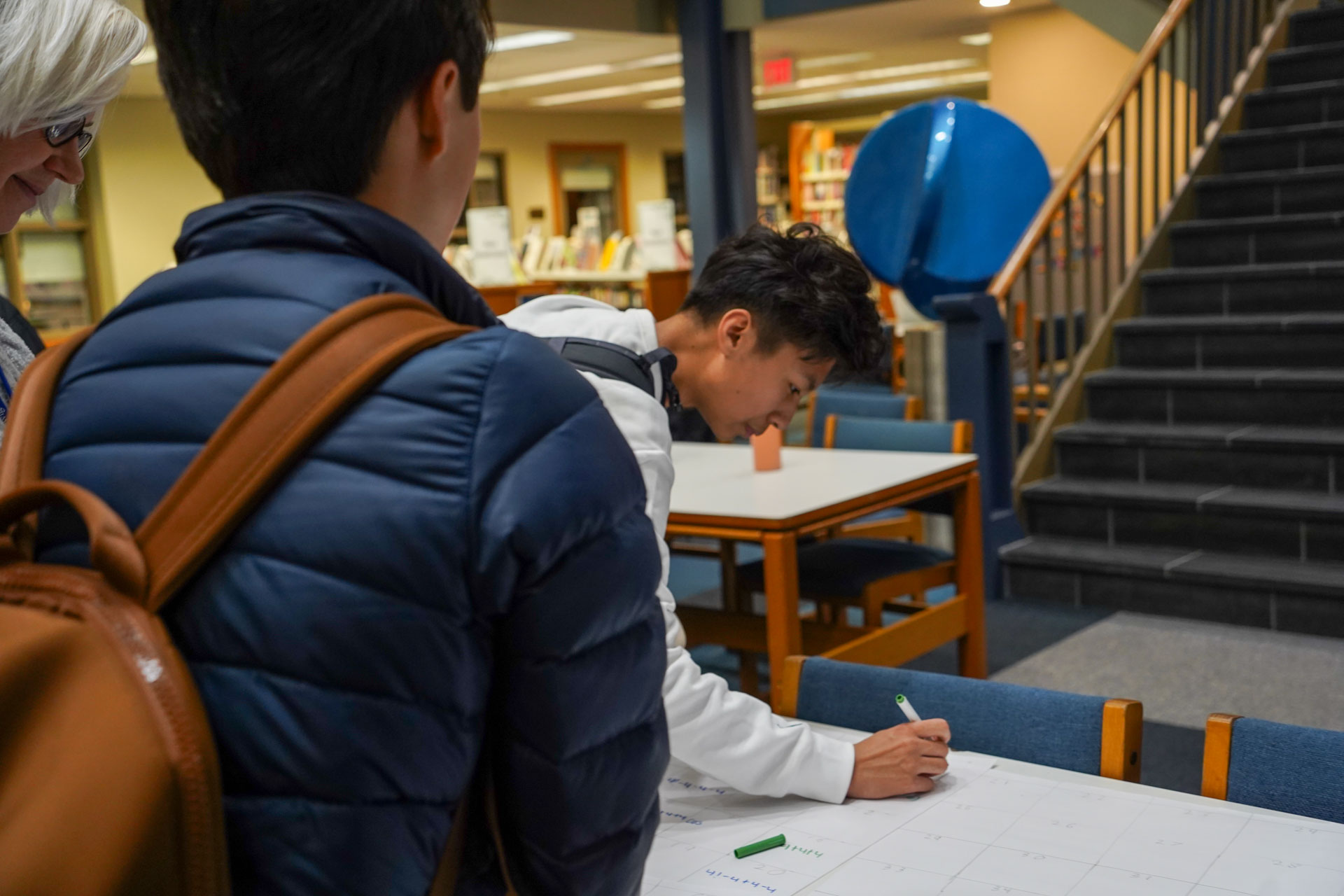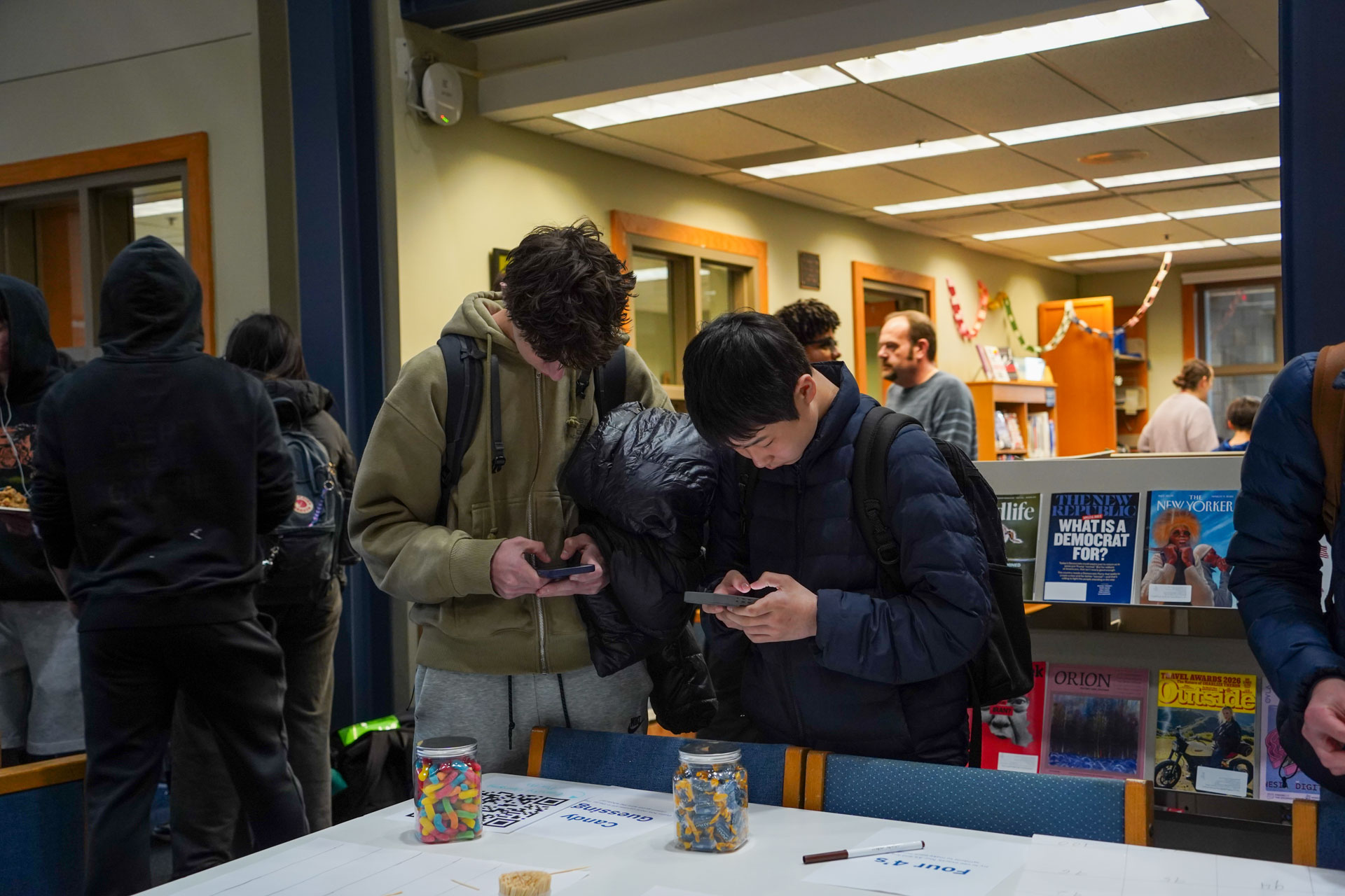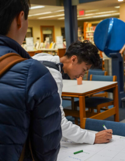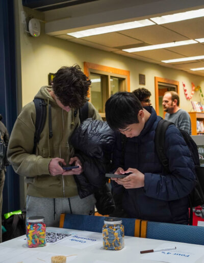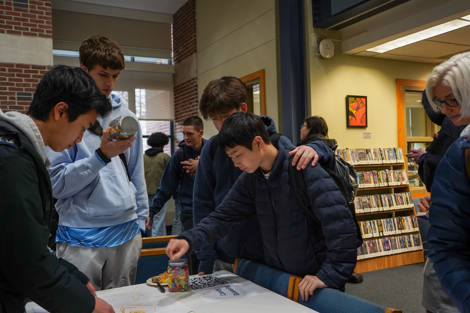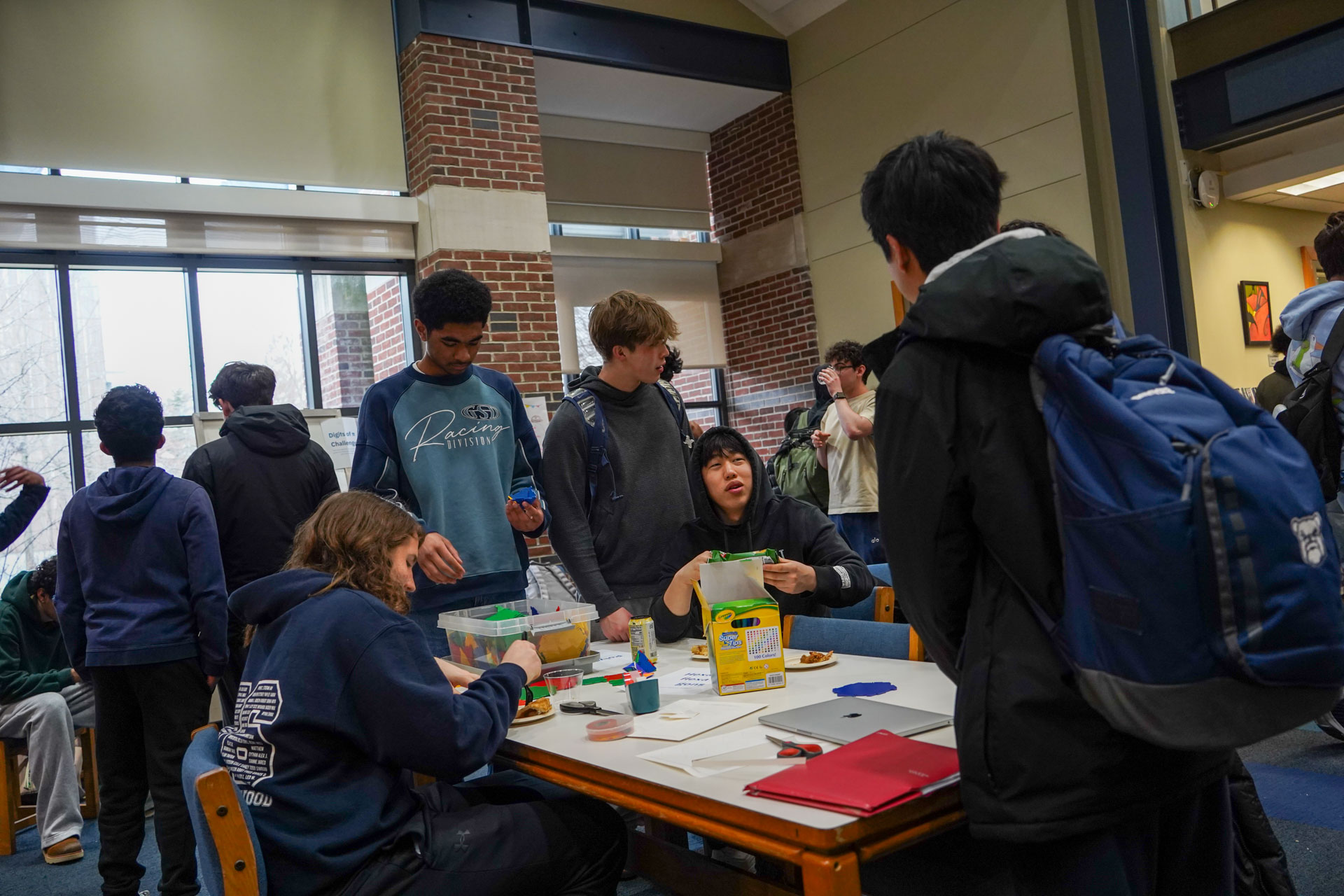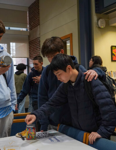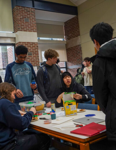 Way to go D-E “Mathletes”! D-E’s Math Club officially recognized “Pi Day” (3.14) earlier this week in Imperatore Library with fun, hands-on activities including “Four 4’s” (featuring a challenge to use exactly four 4’s and any math symbol to make a number); “Hexaflexagons”; “Buffon’s Needle”; board games, a Pi digits memorization competition, and more. Pies and quiches were an apt, added treat. Happy Pi Day, everyone!